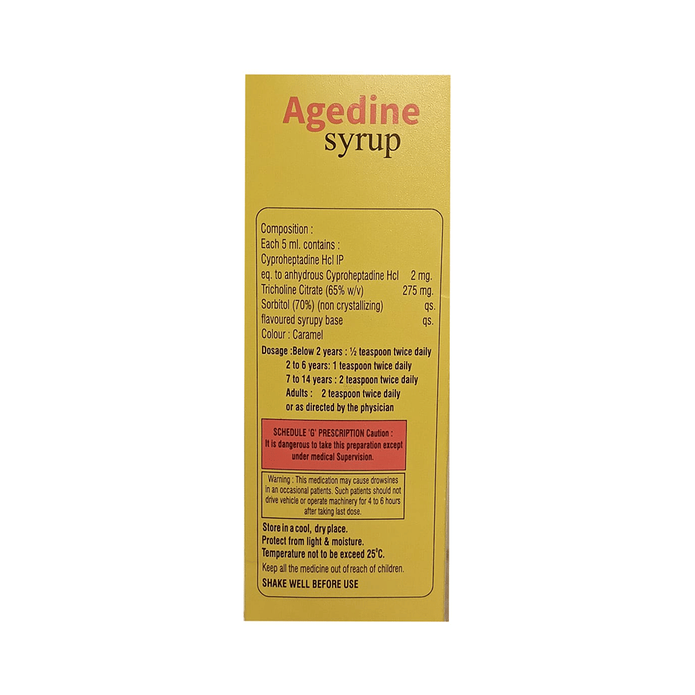 Agedine Syrup is a combination medicine used to treat loss of appetite. It is an effective appetite stimulant. It works by reducing the effect of a chemical messenger which regulates appetite. Agedine Syrup is taken with or without food in a dose and duration as advised by the doctor. The dose you are given will depend on your condition and how you respond to the medicine. You should keep taking this medicine for as long as your doctor recommends. Let your healthcare team know about all other medications you are taking as some may affect, or be affected by this medicine.The most common side effects are constipation, dryness in the mouth, and blurred vision. Most of these are temporary and usually resolve with time. Contact your doctor straight away if you are concerned about any of these. It can cause dizziness, so do not drive or do anything that requires mental focus until you know how this medicine affects you. Avoid drinking alcohol while taking this medicine as it can worsen your sleepiness.Before taking Agedine Syrup, inform your doctor if you have any kidney or liver diseases so that your doctor can prescribe a suitable dose for you. Pregnant or breastfeeding women should also consult their doctor before taking this medicine.