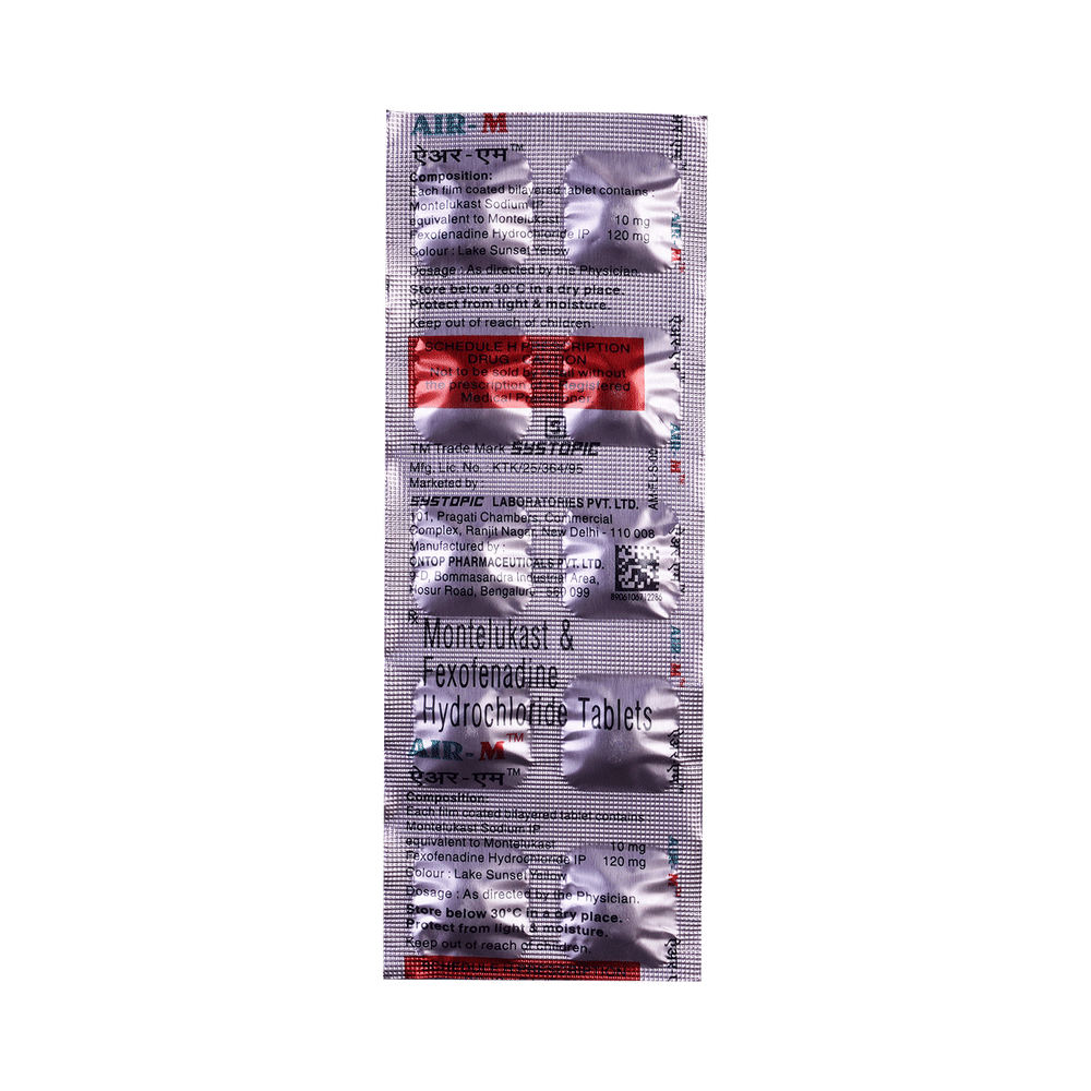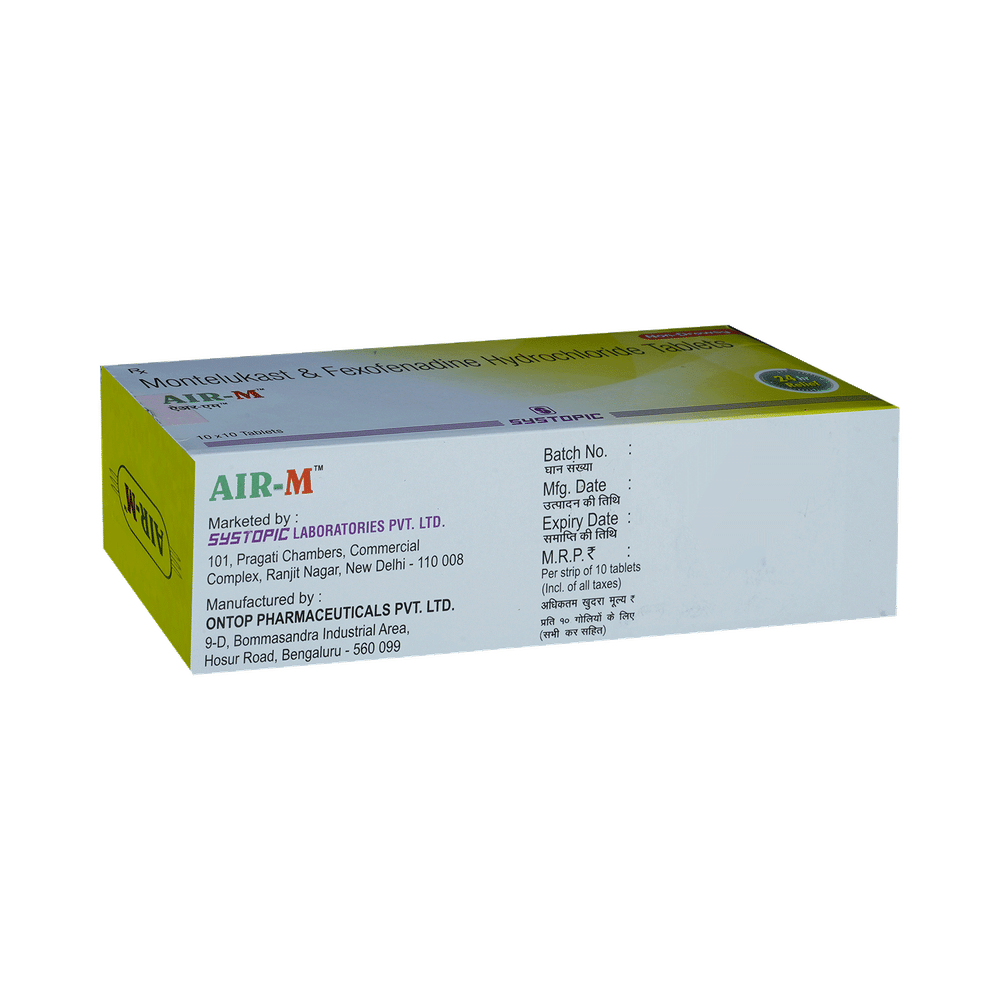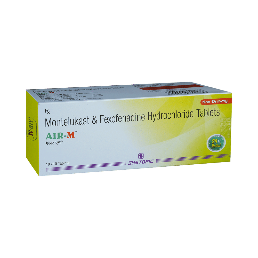 In Treatment of Sneezing and runny nose due to allergiesAir-M Tablet is a combination medicine that provides relief from symptoms such as blocked or runny nose, sneezing and itchy or watery eyes. This will make it easier for you to go about your daily activities. It rarely has any serious side effects and you may only need to take it on days you have symptoms. If you are taking it to prevent getting symptoms you should use it regularly to get the most benefit.