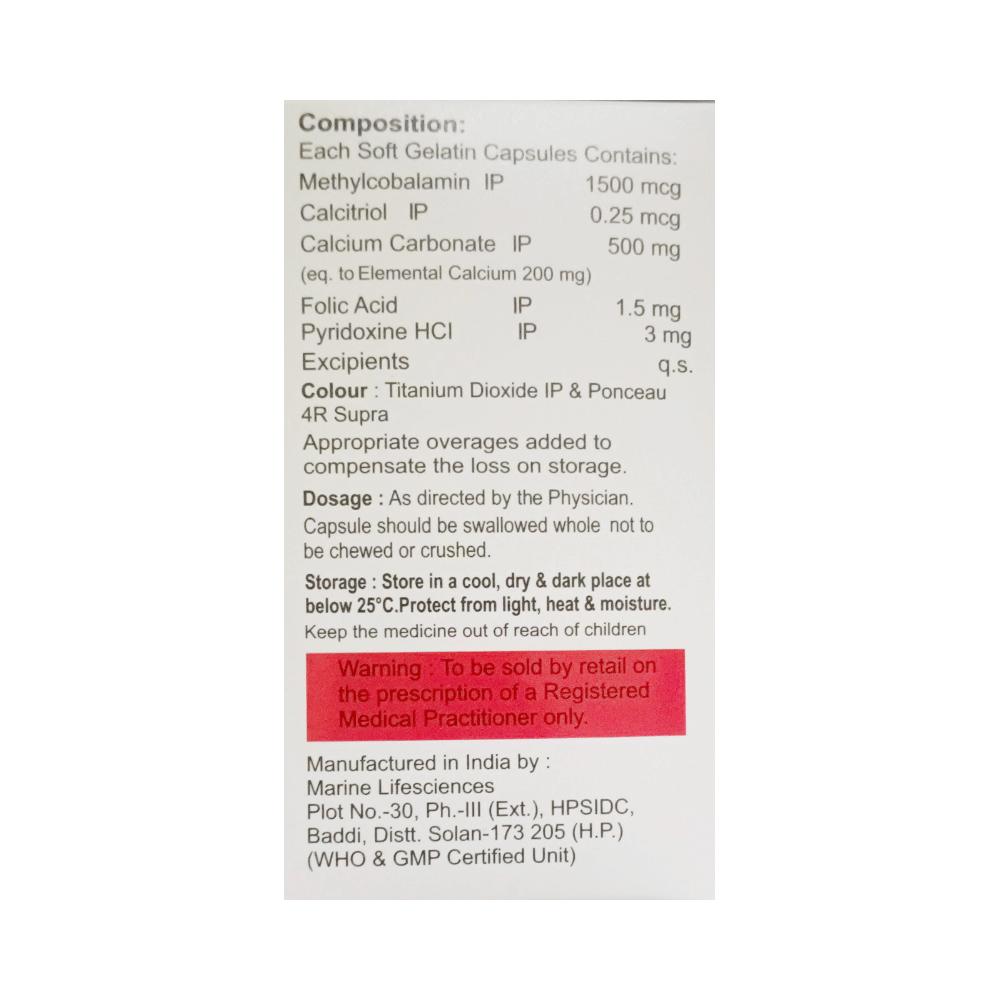 Salt Composition: Calcium (500mg) + Calcitriol (0.25mcg) + Methylcobalamin (1500mcg) + Folic Acid (1.5mg) + Vitamin B6 (Pyridoxine) (3mg)