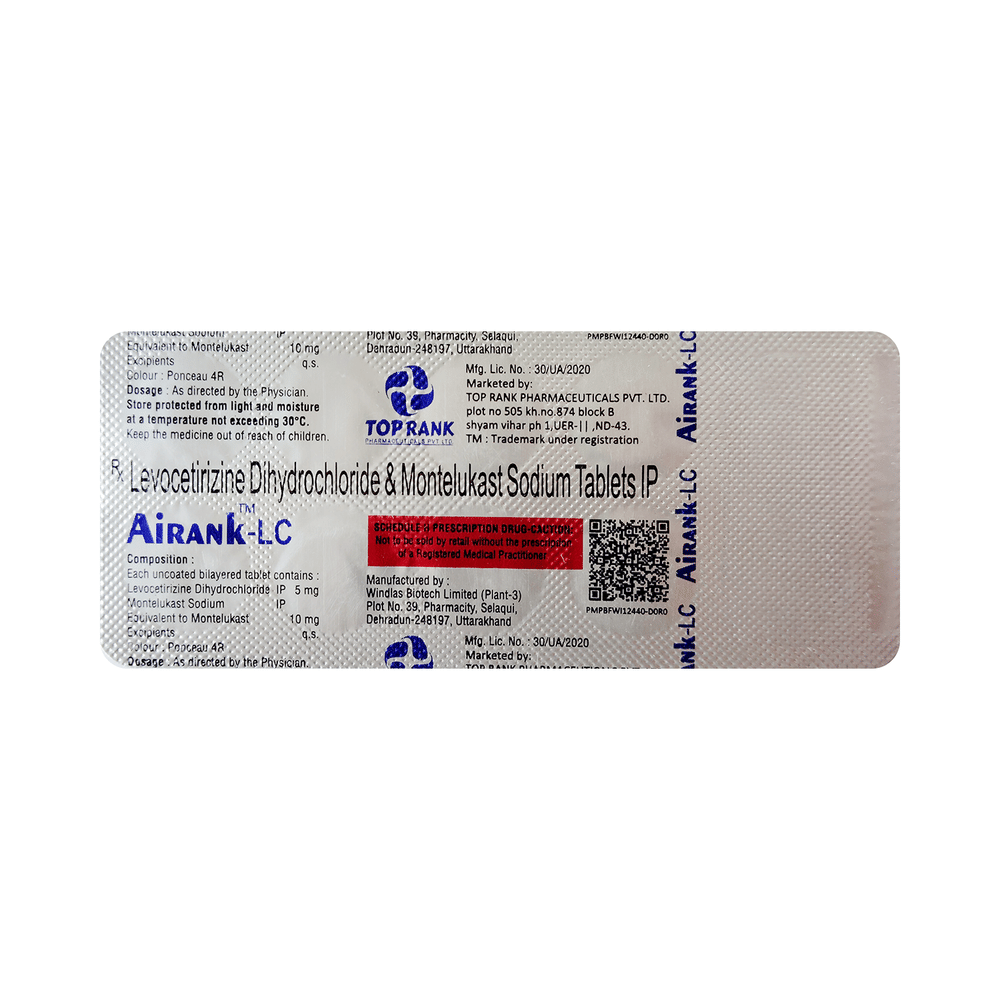 Airank-LC Tablet is a combination of two medicines: Levocetirizine and Montelukast, which relieves sneezing and runny nose due to allergies. Levocetirizine is an antiallergic which blocks a chemical messenger (histamine) responsible for runny nose, watery eyes and sneezing. Montelukast is a leukotriene antagonist. It works by blocking another chemical messenger (leukotriene). This reduces inflammation (swelling) in the airways and nose, and improves symptoms.