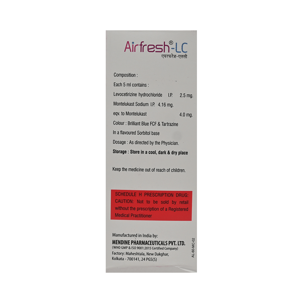 In Treatment of Allergic skin conditionsAirfresh-LC Syrup is effective in treating allergic skin conditions with inflammation and itching. It reduces the actions of chemicals in the body that cause inflammation of the skin. When used correctly it is a safe and effective treatment. It reduces the redness, rash, pain or itchiness caused by your skin’s reaction to an irritant. It thus improves your self-esteem and confidence as your appearance changes. Keep taking it for as long as it is prescribed to get the full benefits.In Treatment of Sneezing and runny nose due to allergiesAirfresh-LC Syrup is a combination medicine that provides relief from symptoms such as blocked or runny nose, sneezing and itchy or watery eyes. This will make it easier for you to go about your daily activities. It rarely has any serious side effects and you may only need to take it on days you have symptoms. If you are taking it to prevent getting symptoms you should use it regularly to get the most benefit.In Treatment of Hay feverHay fever, also called allergic rhinitis, causes cold-like signs and symptoms, such as a runny nose, itchy eyes, congestion, sneezing and sinus pressure. The only difference is that in hay fever, these symptoms are not produced due to a virus but are simply allergic responses of our body to allergens (allergy causing agents such as pollen). Airfresh-LC Syrup is used to provide relief from these symptoms of hay fever. It works by blocking the release of the chemical substance responsible for producing such allergy symptoms. Airfresh-LC Syrup is a safe medicine which helps treat hay fever and makes us feel at ease.show moreshow less
