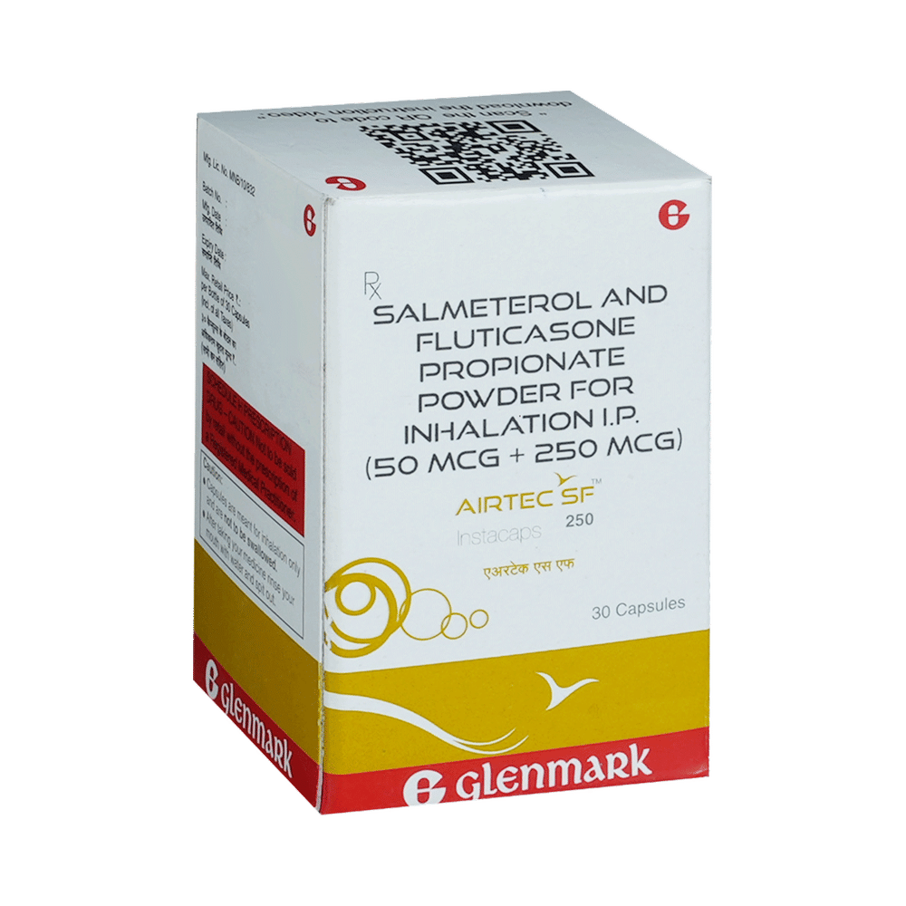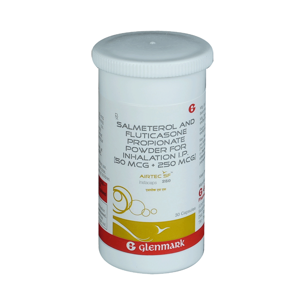 Airtec SF 250 Instacap is a combination of two medicines that opens the airways and makes it easier to breathe. It is used in the treatment of asthma (wheezing and shortness of breath) and chronic obstructive pulmonary disorder (a lung disorder in which the flow of air to the lungs is blocked). Your doctor will tell you how often you need to use your inhaler. The effect of this medicine may be noticeable after a few days but will only reach its maximum after a few weeks. This medicine must be used regularly to be effective, so go on taking it even if you don't have any symptoms. That means it’s doing its job. If you stop taking it your asthma and chronic obstructive pulmonary disorder (COPD) may get worse. It should not be used to relieve sudden asthma attacks. If an asthma attack occurs, use your quick-relief inhaler (reliever). To get the benefit from this medicine you need to make sure you get your inhaler technique right, otherwise, it does not work as well.The most common side effects are nausea, vomiting, respiratory tract infection, fungal infections in the mouth, headache, hoarseness of voice, sore throat, cough, musculoskeletal (bone, muscle, or joint) pain, and increased heart rate. If you get there, do not stop taking it but do talk to your doctor. You can help prevent some of these symptoms by rinsing your mouth and throat with water or brushing your teeth after using your inhaler. There are other, rarer side effects that can be serious. Talk to your doctor if you're worried about them. In general, you should be trying to avoid situations that make your asthma worse (your triggers) and try not to smoke.Ask your doctor whether it’s safe to take this medicine if you're pregnant or breastfeeding. Before taking it, you should tell your doctor if you have any kidney or liver diseases so that your doctor can prescribe a suitable dose for you.