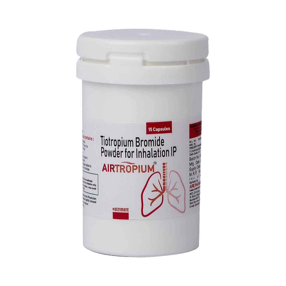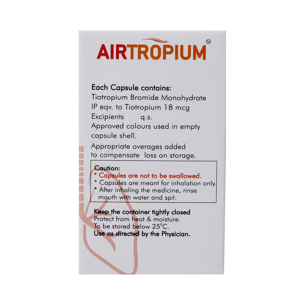 Airtropium Capsule is an anticholinergic medicine. It is used in the treatment of chronic obstructive pulmonary disease and asthma. It relaxes the airway muscles and makes it easier to breathe. This helps relieve symptoms such as chest tightness, shortness of breath, wheezing, and coughing. Airtropium Capsule is only for inhalational purpose, use it in the dose and duration as prescribed by your doctor. The first dose is given under medical supervision to prevent the side effects happen during first use. For better results, it is suggested to take it at the same time every day. The dose and how often you take it depends on what you are taking it for. Your doctor will decide how much you need to improve your symptoms. You should take this medicine for as long as it is prescribed for you. It does not prevent the already started breathing trouble or asthma attack, hence always carry your medical inhaler with you for an emergency.The most common side effect of this medicine is dry mouth. If these bother you or appear serious, let your doctor know. To overcome dry mouth, it is advised to increase water intake, carry sugar candy, or maintain good oral hygiene. If you experience any other side effects, let your doctor know.Before taking this medicine, let your doctor know if you have liver or kidney disease, or if you are pregnant or breastfeeding. Your doctor should also know about all other medicines you are taking as many of these may make this medicine less effective or change the way it works.