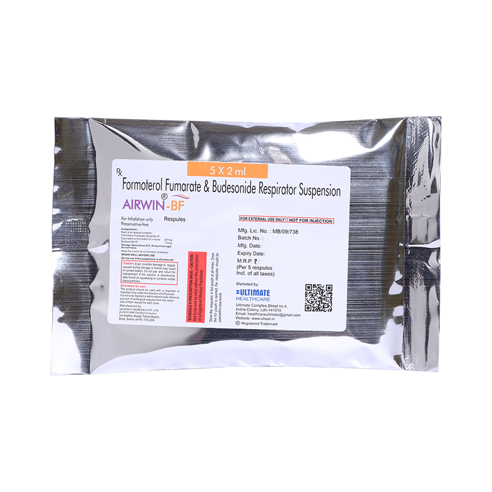 Airwin-BF (2 ml each) Respules is a combination of two medicines in one inhaler. It relieves the long-term symptoms of asthma and COPD, making breathing easier. It works by inhibiting the release of certain chemical messengers that cause inflammation (swelling) and relaxes the muscles in the airways. Your doctor will tell you how often you need to use your inhaler. The effect of this medicine may be noticeable after a few days but will only reach its maximum after a few weeks. This medicine must be used regularly to be effective, so go on taking it even if you don't have any symptoms. That means it’s doing its job. If you stop taking it your symptoms may get worse. This medicine should not be used to relieve sudden shortness of breath. If sudden shortness of breath occurs, use your rescue inhaler. To get the benefit from this medicine you need to make sure you get your inhaler technique right, otherwise, it does not work as well.The most common side effects include headache, nausea, vomiting, stomach discomfort, and respiratory tract infection. If you get there, don’t stop taking it but do talk to your doctor. You can prevent some of these symptoms by rinsing your mouth and throat with water or brushing your teeth after using your inhaler. There are other, rarer side effects which can be serious. Talk to your doctor if you're worried about them.Before taking it, you should tell your doctor if you have any kidney or liver diseases so that your doctor can prescribe a suitable dose for you. You should also tell your doctor if you are pregnant, planning pregnancy or breastfeeding.