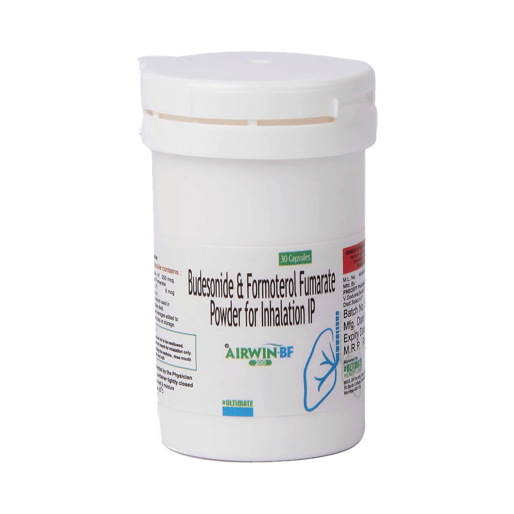 Airwin-BF 200 Capsule is a combination of two medicines in one inhaler. It relieves the long-term symptoms of asthma and COPD, making breathing easier. It works by inhibiting the release of certain chemical messengers that cause inflammation (swelling) and relaxes the muscles in the airways. Your doctor will tell you how often you need to use your inhaler. The effect of this medicine may be noticeable after a few days but will only reach its maximum after a few weeks. This medicine must be used regularly to be effective, so go on taking it even if you don't have any symptoms. That means it’s doing its job. If you stop taking it your symptoms may get worse. This medicine should not be used to relieve sudden shortness of breath. If sudden shortness of breath occurs, use your rescue inhaler. To get the benefit from this medicine you need to make sure you get your inhaler technique right, otherwise, it does not work as well.The most common side effects include headache, nausea, vomiting, stomach discomfort, and respiratory tract infection. If you get there, don’t stop taking it but do talk to your doctor. You can prevent some of these symptoms by rinsing your mouth and throat with water or brushing your teeth after using your inhaler. There are other, rarer side effects which can be serious. Talk to your doctor if you're worried about them.Before taking it, you should tell your doctor if you have any kidney or liver diseases so that your doctor can prescribe a suitable dose for you. You should also tell your doctor if you are pregnant, planning pregnancy or breastfeeding.