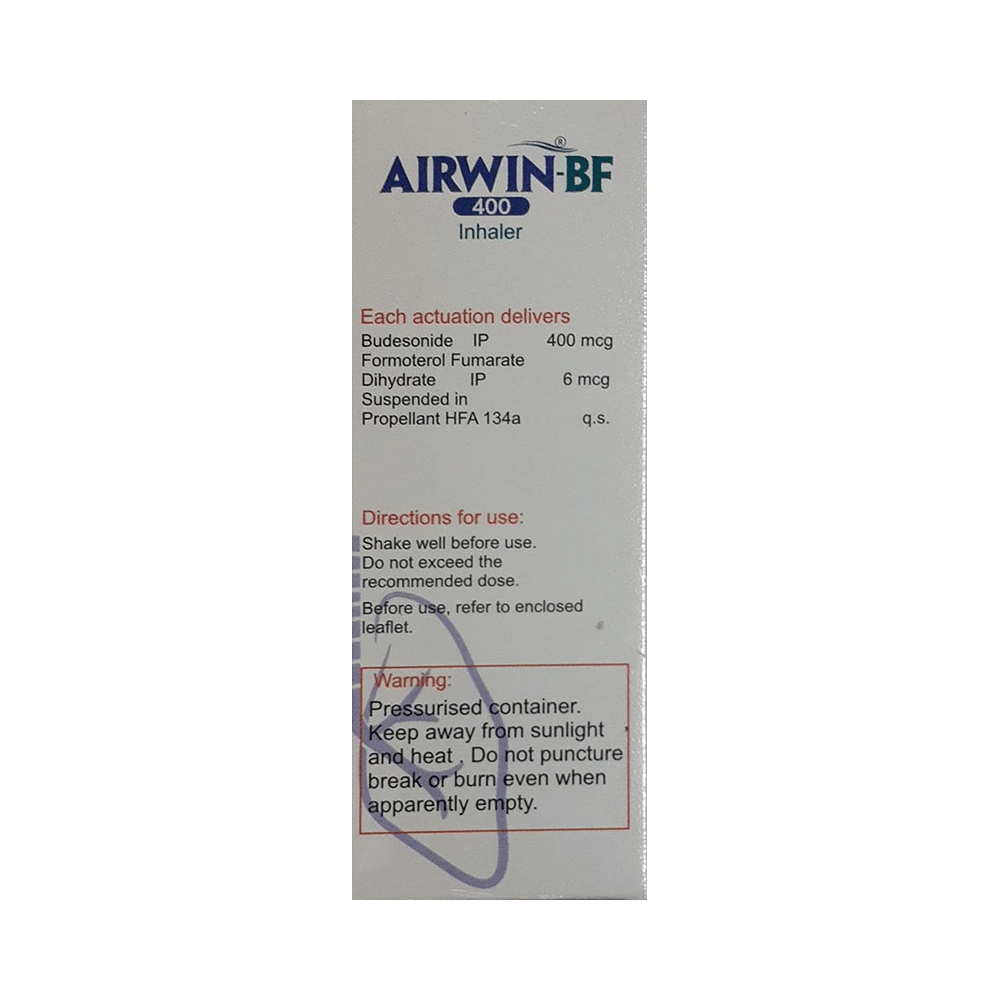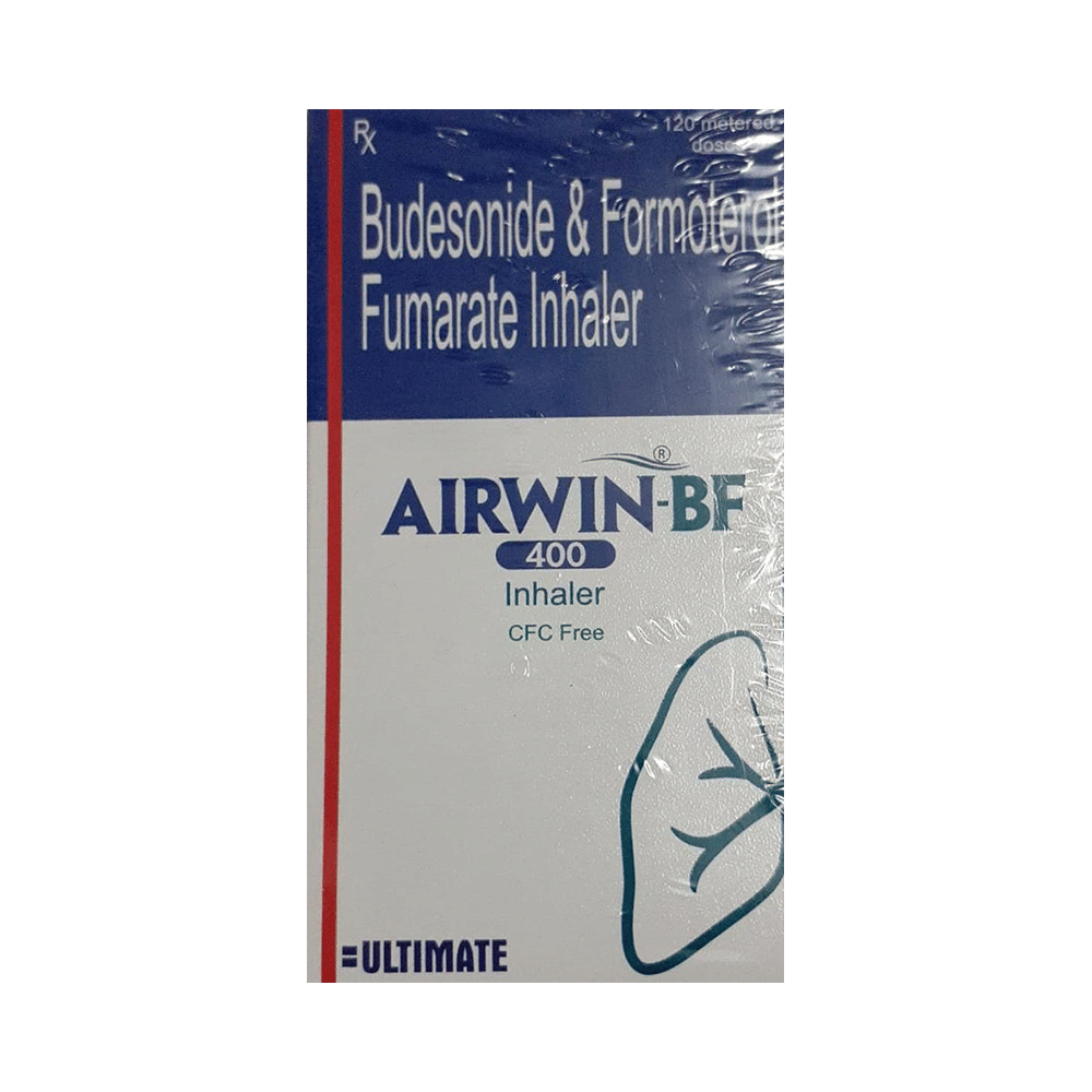Airwin-BF 400 Inhaler is a combination of two medicines in one inhaler. It relieves the long-term symptoms of asthma and COPD, making breathing easier. It works by inhibiting the release of certain chemical messengers that cause inflammation (swelling) and relaxes the muscles in the airways. Your doctor will tell you how often you need to use your inhaler. The effect of this medicine may be noticeable after a few days but will only reach its maximum after a few weeks. This medicine must be used regularly to be effective, so go on taking it even if you don't have any symptoms. That means it’s doing its job. If you stop taking it your symptoms may get worse. This medicine should not be used to relieve sudden shortness of breath. If sudden shortness of breath occurs, use your rescue inhaler. To get the benefit from this medicine you need to make sure you get your inhaler technique right, otherwise, it does not work as well.The most common side effects include headache, nausea, vomiting, stomach discomfort, and respiratory tract infection. If you get there, don’t stop taking it but do talk to your doctor. You can prevent some of these symptoms by rinsing your mouth and throat with water or brushing your teeth after using your inhaler. There are other, rarer side effects which can be serious. Talk to your doctor if you're worried about them.Before taking it, you should tell your doctor if you have any kidney or liver diseases so that your doctor can prescribe a suitable dose for you. You should also tell your doctor if you are pregnant, planning pregnancy or breastfeeding.