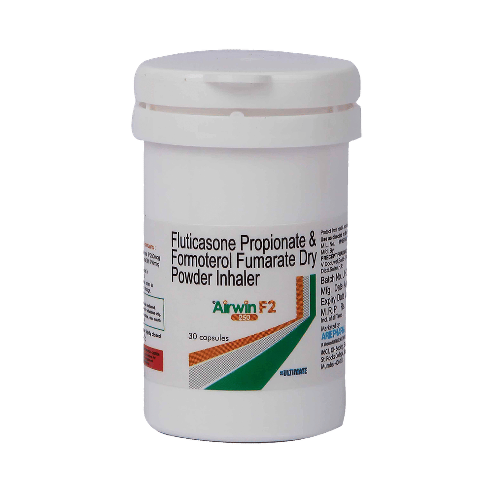 Airwin F2 250 Capsule is a combination of two medicines: Formoterol and Fluticasone Propionate. Formoterol is a long-acting bronchodilator which works by relaxing the muscles in the airways and widens the airways. Fluticasone Propionate is a steroid. It works by stopping the release of certain chemical messengers that cause inflammation (swelling) of the airways. Together, they make breathing easier.