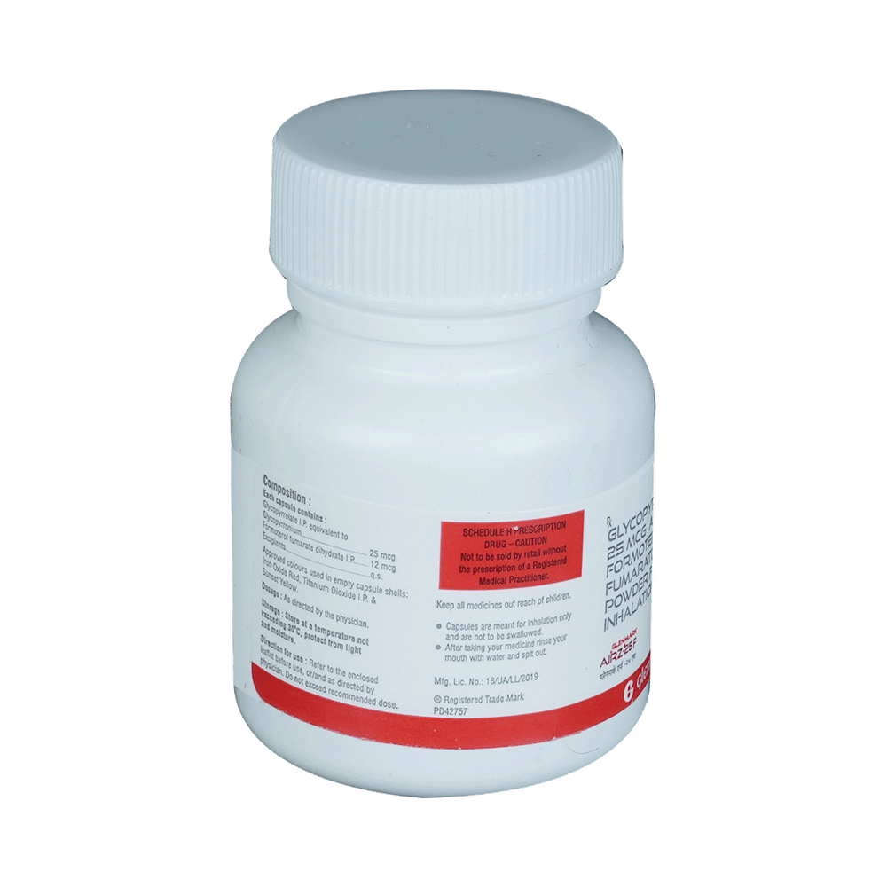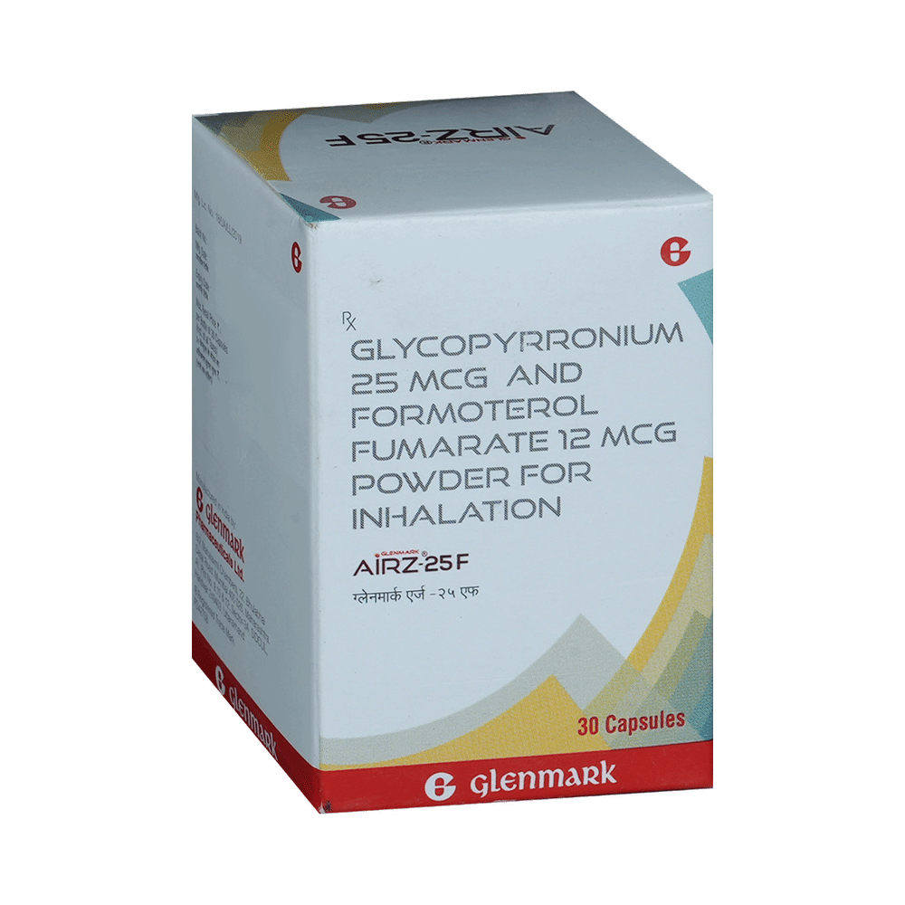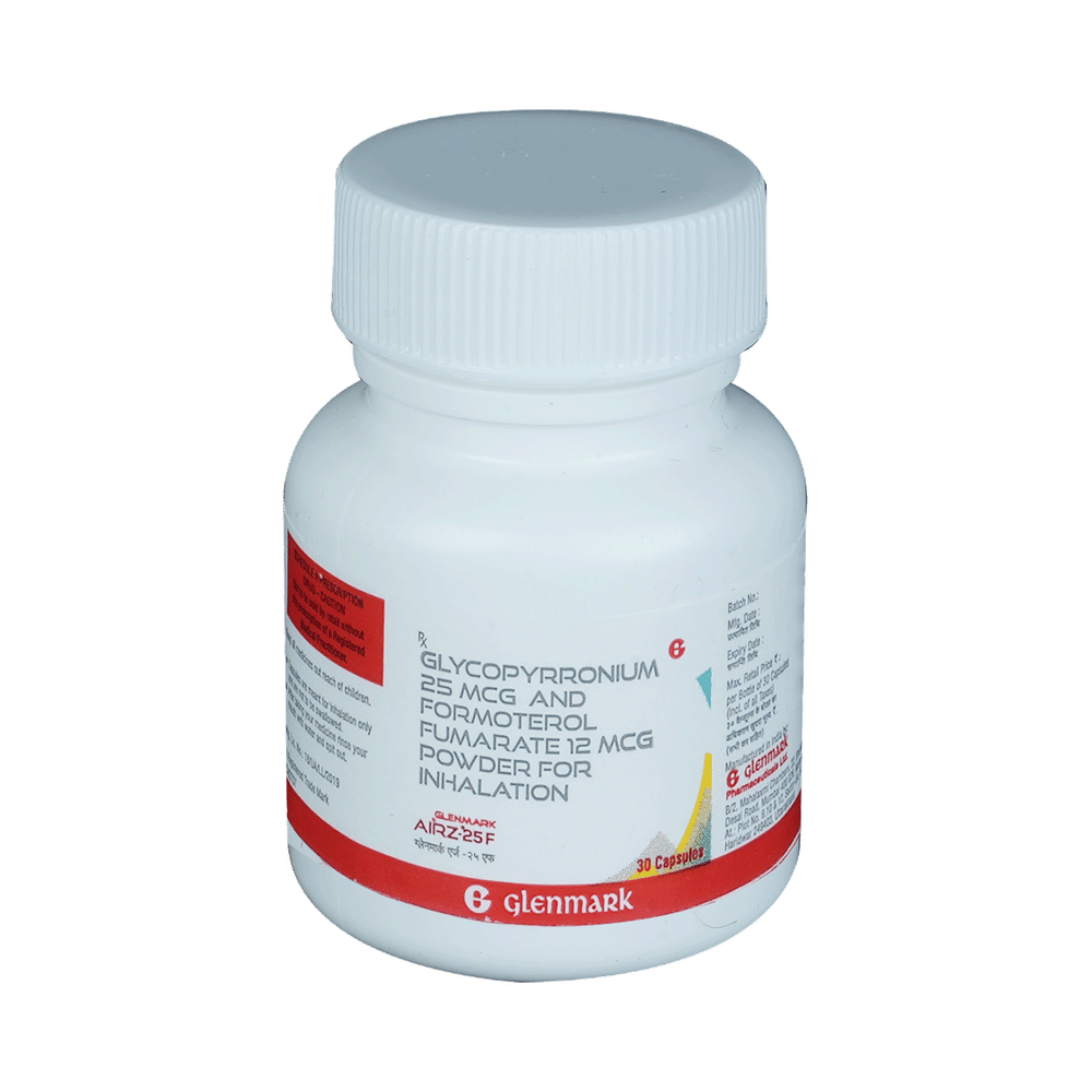 Airz 25F Capsule is a combination of two medicines that makes breathing easier for patients with chronic obstructive pulmonary disease (COPD). It works by stopping the release of certain chemical messengers that cause inflammation (swelling), thus relaxing the muscles in the airways. Your doctor will tell you how often you need to use your inhaler. It’s important that you take the lowest dose needed to effectively control your asthma. The effect of this medicine may be noticeable after a few days but will only reach its maximum after a few weeks. This medicine must be used regularly to be effective, so go on taking it even if you don't have any symptoms. That means it’s doing its job. If you stop taking it your asthma may get worse. It should not be used to relieve sudden asthma attacks. If an asthma attack occurs, use your quick-relief inhaler (reliever). The most common side effects are indigestion, nasopharyngitis (inflammation of the throat and nasal passages), chest pain, fever, sore throat, cough, headache, sinus inflammation, inflammation of the nose, and urinary tract infection. If you get these symptoms, don’t stop taking it but do talk to your doctor. You can help prevent these symptoms by rinsing your mouth and throat with water or brushing your teeth after using your inhaler. In general, you should be trying to avoid situations that make your asthma worse (your triggers) and try not to smoke.Before taking Airz 25F Capsule, you should tell your doctor if you have any infections in your mouth or lungs, and liver or kidney disease. Ask your doctor whether it’s safe to take this medicine if you're pregnant or breastfeeding.
