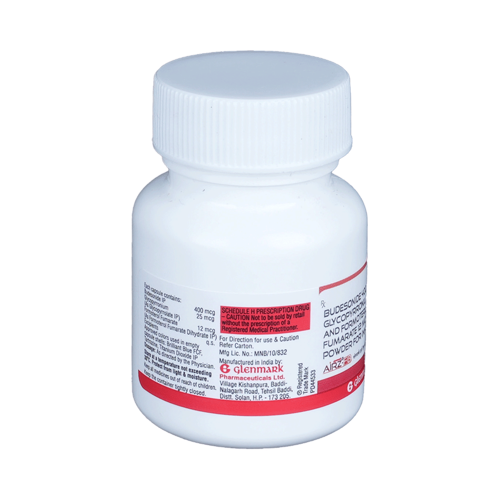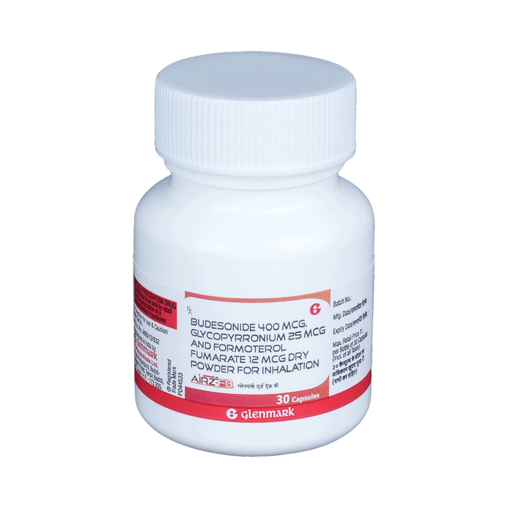 airZ-FB Capsule is a combination of three medicines : Glycopyrrolate, Formoterol, and Budesonide. Glycopyrrolate is an anticholinergic medication. It works by blocking the activity of a chemical messenger (acetylcholine) in the brain. Formoterol is a bronchodilator. It works by relaxing the muscles in the airways and widens airways. This makes breathing easier. Budesonide is a steroid which works by blocking the production of certain chemical messengers in the body that cause inflammation (redness and swelling) and allergies.