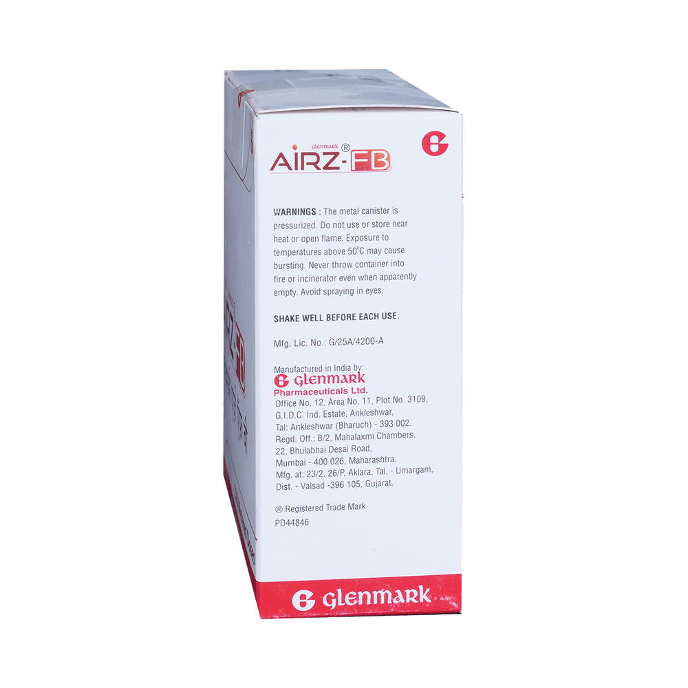 Airz FB Inhaler is a combination of three medicines. It is used in the treatment of chronic obstructive pulmonary disease (COPD). It works in various ways and reduces the symptoms of the disease such as coughing, chest tightness, and shortness of breath. Airz FB Inhaler should be used in the dose and duration as prescribed by your doctor. Use it regularly and as long as your doctor has prescribed it to get maximum benefits from the medicine. Don’t stop using the medicine even if you feel better unless your doctor tells you to. If you stop, your breathing problems could get worse.Airz FB Inhaler is generally safe and effective but some common side effects include dizziness, headache, vomiting, and stuffy nose (nasal congestion). These side effects are usually mild and should gradually improve as your body gets used to this medicine. Let your doctor know if you are bothered by any of this, or if you experience any other side effects which you think are caused by the medicine.Before using Airz FB Inhaler, let your doctor know if you have any preexisting medical conditions. Let your doctor also know all the other medicines you are taking. Additionally, to make sure it is safe for you, tell your doctor if you are pregnant or breastfeeding before taking this medicine. You shouldn’t smoke while on treatment with this medicine. Smoking causes damage to your lungs and will make your condition worse.