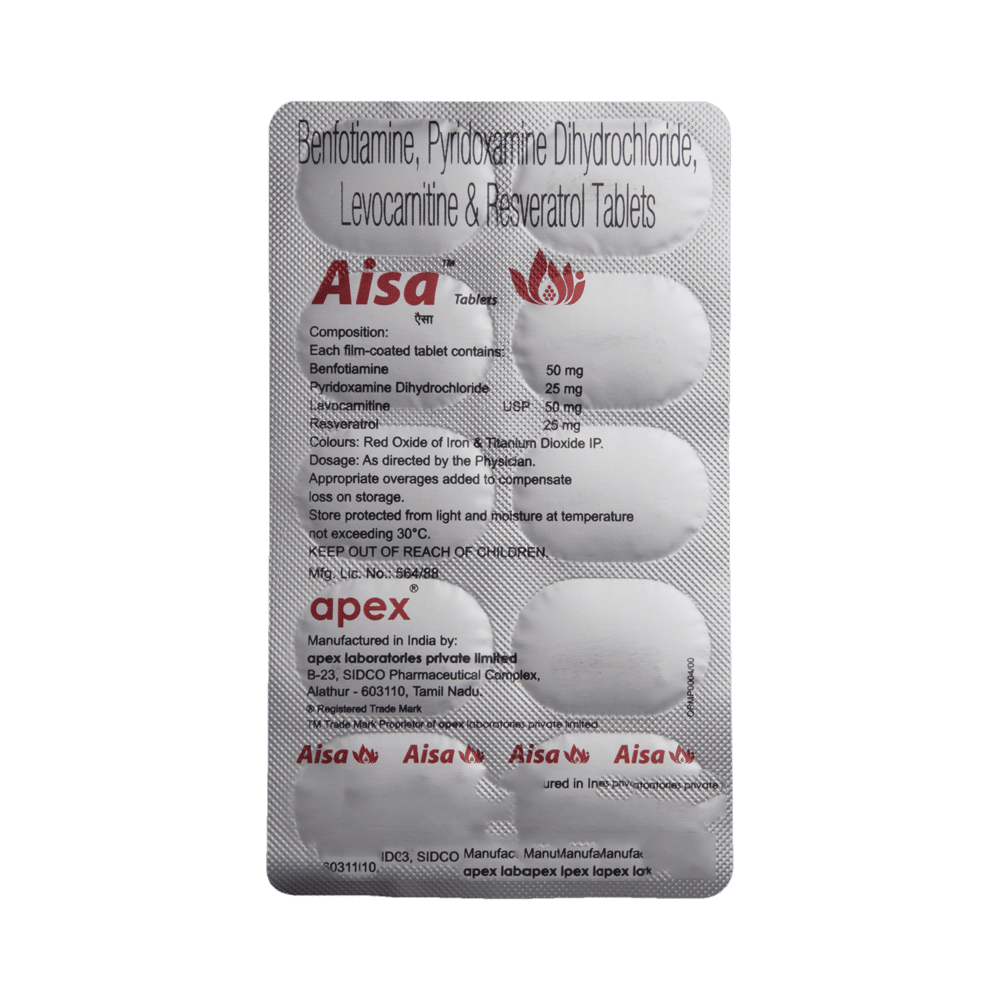 Aisa Tablet is a combination of four nutritional supplements: Benfotiamine, Levo-carnitine, Resveratrol, and Vitamin B6 (Pyridoxine). Together, these replenish the body's stores of important nutrients.