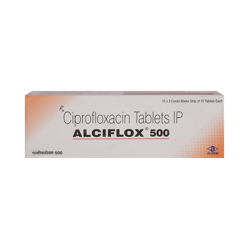 Alciflox 500mg Tablet is an antibiotic, used in the treatment of bacterial infections. It is also used in treating infections of the urinary tract, nose, throat, skin and soft tissues and lungs (pneumonia). It cures the infection by killing and stopping the growth of the infectious microorganisms. Alciflox 500mg Tablet should be used in the dose and duration as advised by your doctor. It may be taken with or without food, preferably at a fixed time. Avoid skipping any doses and finish the full course of treatment even if you feel better. Do not take a double dose to make up for a missed dose. Simply take the next dose as planned.Common side effects include headache, dizziness, and gastrointestinal disorder such as nausea. This is usually temporary and resolves on its own, but please consult your doctor if it bothers you or persists for a longer duration. Diarrhea may also occur as a side effect but should stop when your course is complete. Inform your doctor if it does not stop or if you find blood in your stools.You should not take this medicine if you are allergic to any of its ingredients. Rarely, some people may have a severe allergic reaction which needs urgent medical attention. Signs of this include rash, swelling of the lips, tongue, or face, shortness of breath, or breathing problems. Special care should be taken in people with kidney problems while taking this medicine.