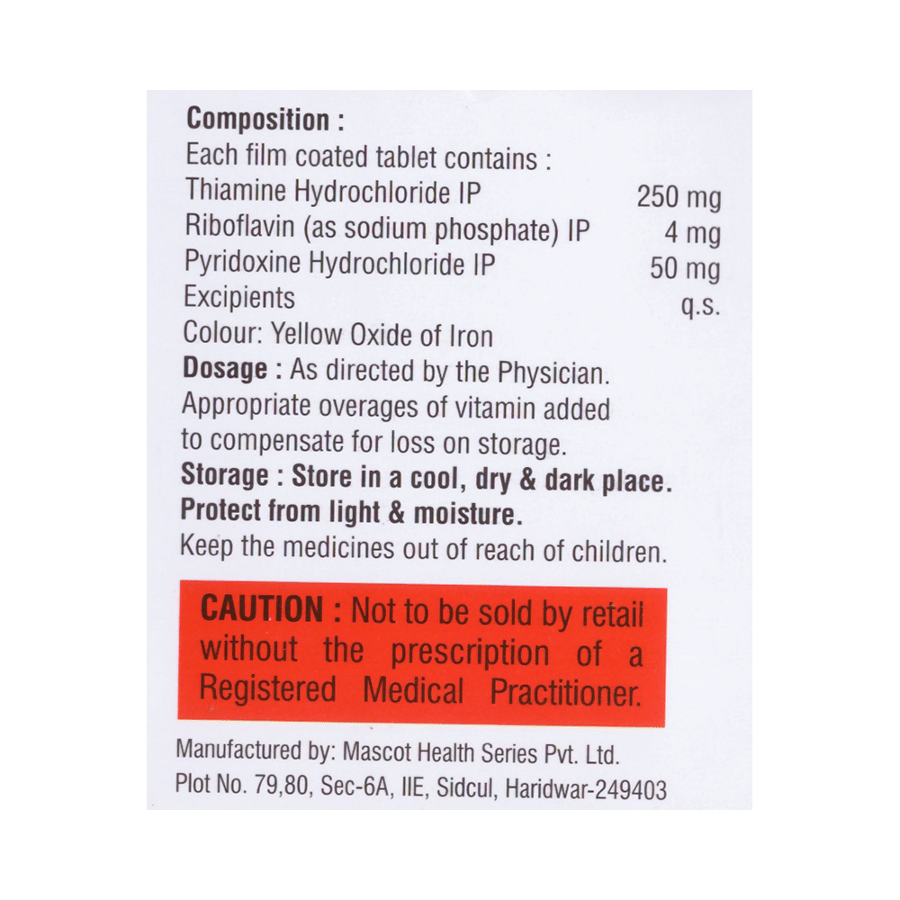Salt Composition: Thiamine(Vitamin B1) (250mg) + Vitamin B2 (4mg) + Vitamin B6 (Pyridoxine) (50mg)