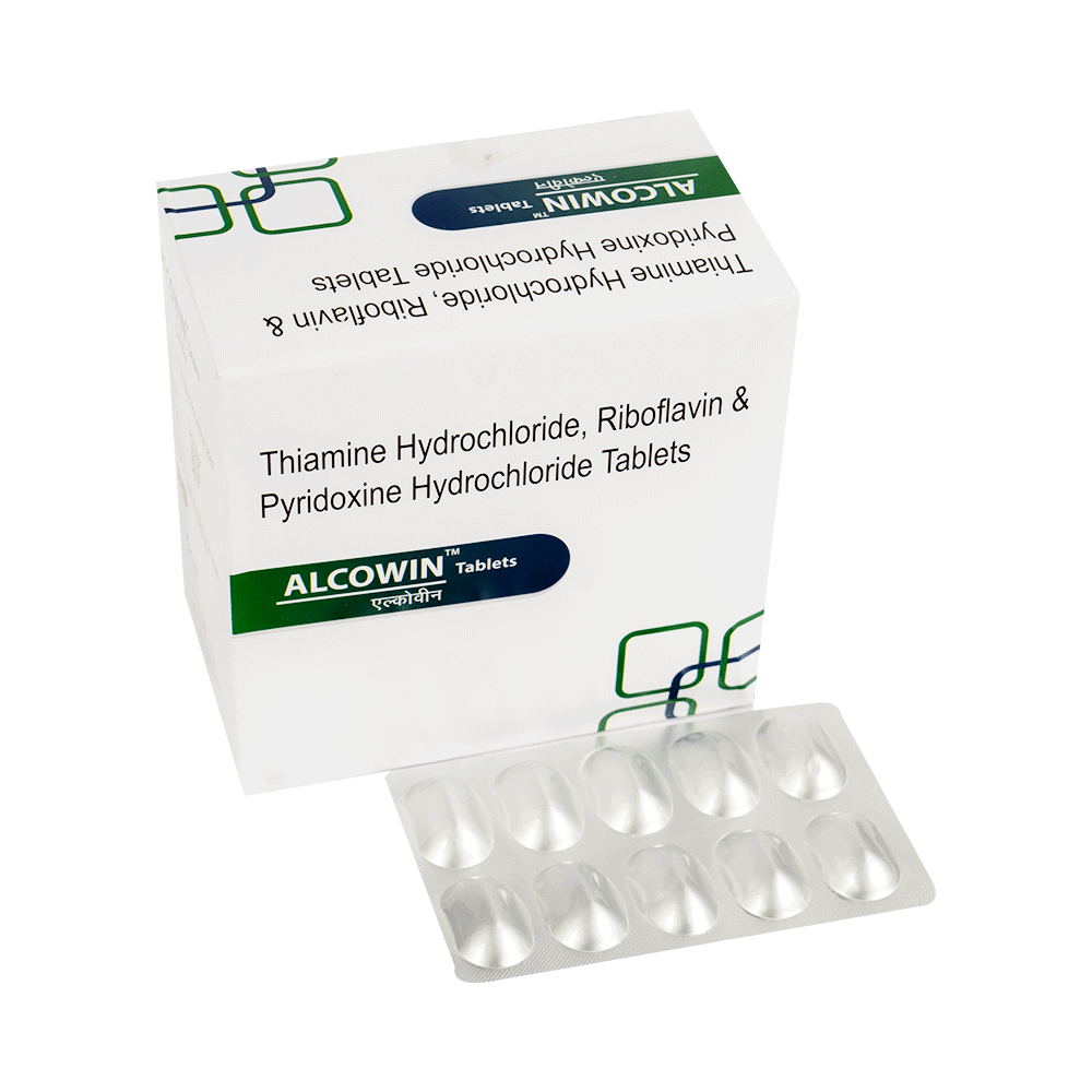 Alcowin Tablet is a combination of vitamin B1, B2, and B6. Thiamine (vitamin B1) is required by the body to properly use carbohydrates. It also helps maintain proper nerve function. Vitamin B2 works with the other B vitamins. It is vital for body growth. It aids in red blood cell production. It also helps in the release of energy from proteins. Pyridoxine (vitamin B6) treats or prevents deficiency of vitamin B6 and improves functioning of nervous and immune systems.