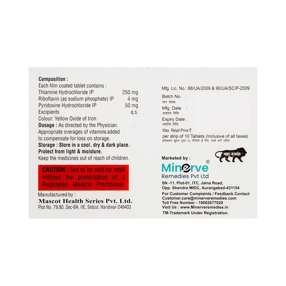 Salt Composition: Thiamine(Vitamin B1) (250mg) + Vitamin B2 (4mg) + Vitamin B6 (Pyridoxine) (50mg)