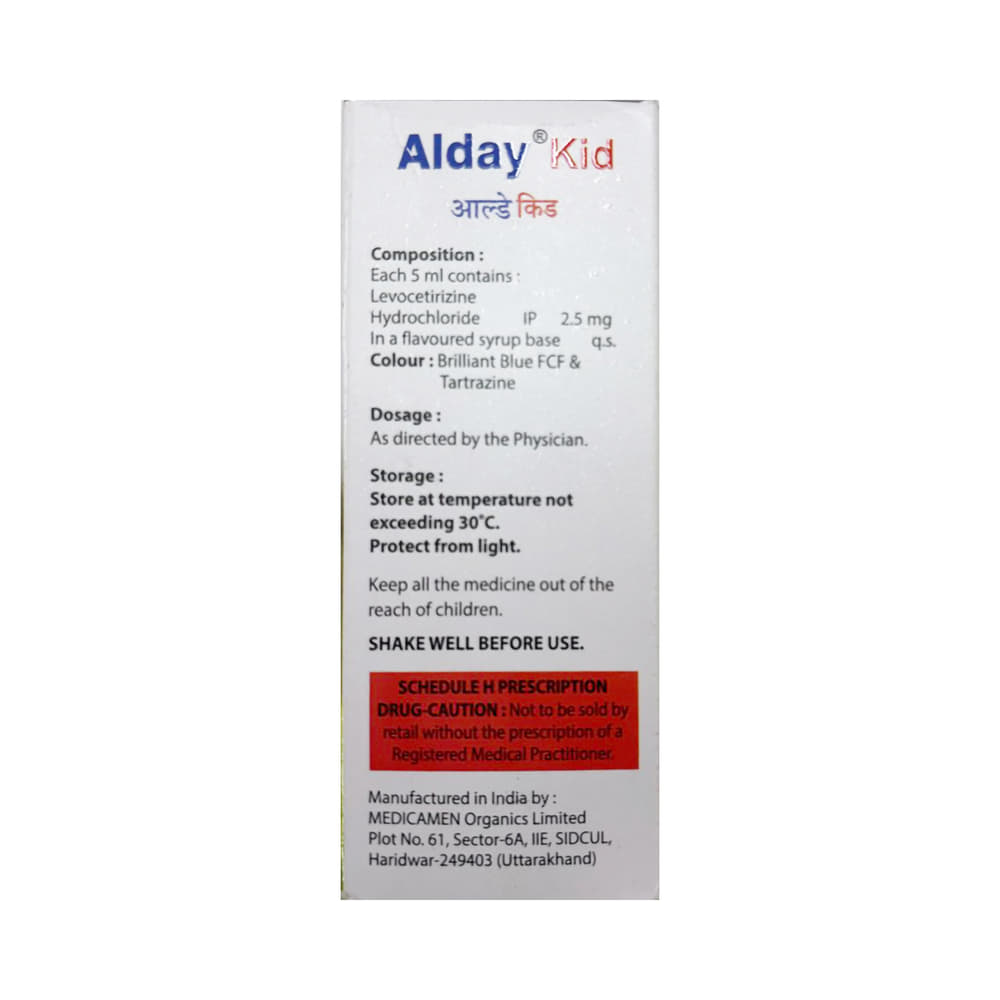 Alday Kid Syrup is given to children to treat a wide range of symptoms caused due to allergic conditions like hay fever, urticaria (hives), conjunctivitis (red, itchy eye), and common cold. These symptoms may include watery eyes, runny nose, sneezing, and itching. Alday Kid Syrup can be taken with or without food. The dose required by you may vary depending on what you are taking it for. This medicine is usually taken in the evening, but follow the advice of your doctor on how to take it. You may need this medicine only on days you have symptoms, but if you are taking it to prevent the symptoms then you should take it regularly. If you miss doses or stop taking it earlier than advised, your symptoms may come back.This medicine is generally very safe. The most common side effects include feeling sleepy or dizzy, dry mouth, fatigue, and headache. These are usually mild and go away after a couple of days as your body adjusts to it. Consult your doctor if any of the side effects persist or worry you.Before taking it, tell your doctor if you have any kidney problems or epilepsy (seizures). Your dose may need to be modified or this medicine may not suit you. Some other medicines can interact with this medicine so let your healthcare team know what else you are taking. You should also talk to your doctor before using this medicine if you are pregnant or breastfeeding, although it is not thought to be harmful.