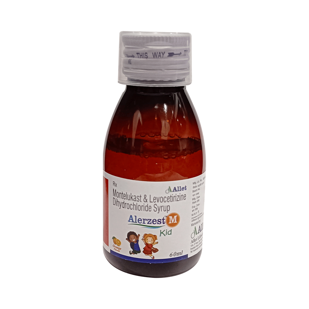 Alerzest M Kid Syrup Orange is commonly prescribed in children to treat symptoms of allergy such as runny nose, sneezing, itching, swelling, congestion, and watery eyes. It may also help in the treatment of asthma and skin allergies. Give this medicine to your child at a fixed time before or after food in the prescribed dose, time, and way. For asthma, prefer giving Alerzest M Kid Syrup Orange in the evening or 2 hours before physical activity. For allergy, it is best to give it either in the morning or in the evening, depending upon the time of onset of symptoms. In case your child has both, prefer giving it in the evening. If your child vomits within 30 minutes of taking this medicine, give the same dose again, but skip it if it’s already time for the next dose.Your child may start to feel better after a few regular doses. However, you must still complete the prescribed dose to ensure maximum benefit. Moreover, stopping the medicine abruptly may worsen your child’s condition. This medicine may cause some minor and temporary side effects like vomiting, diarrhea, nausea, dizziness, dry mouth, rash, and headache. Usually, these episodes subside once your child’s body adapts to the medicine. However, in case these effects persist or start bothering your child, consult your child’s doctor without any delay.Let your child’s doctor know if your child is already taking any medicines. Also, narrate your child’s complete medical history, including any prior episodes of allergy, heart problem, blood disorder, vascular disorders, birth defects, airway obstruction, lung anomaly, skin disorder, liver impairment, and kidney malfunction. This information is critical for dose alterations and in planning your child’s overall treatment.