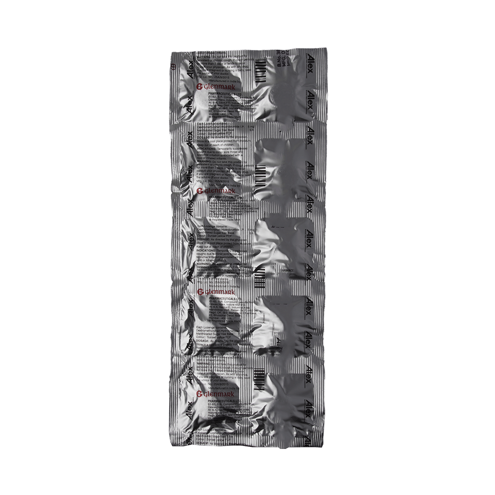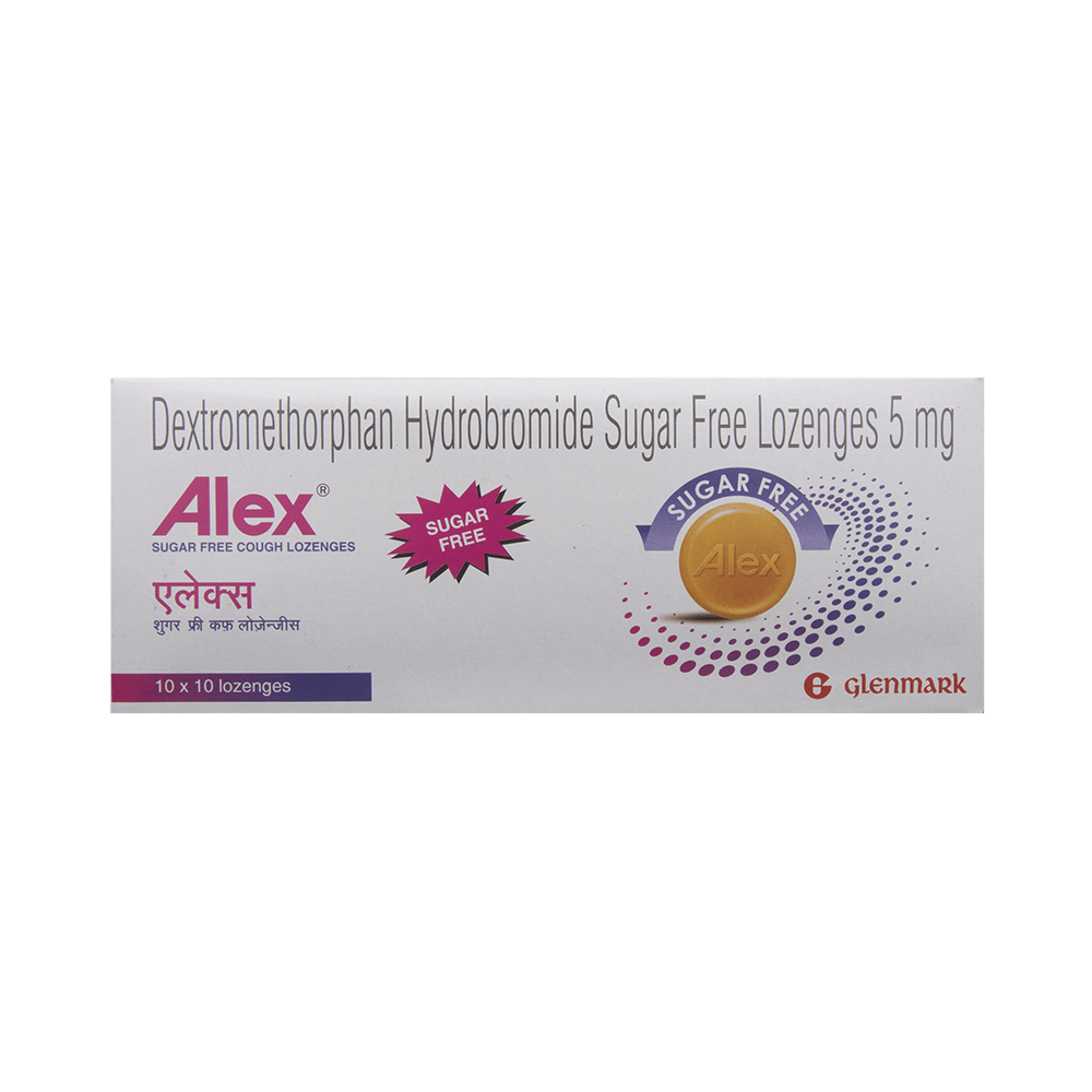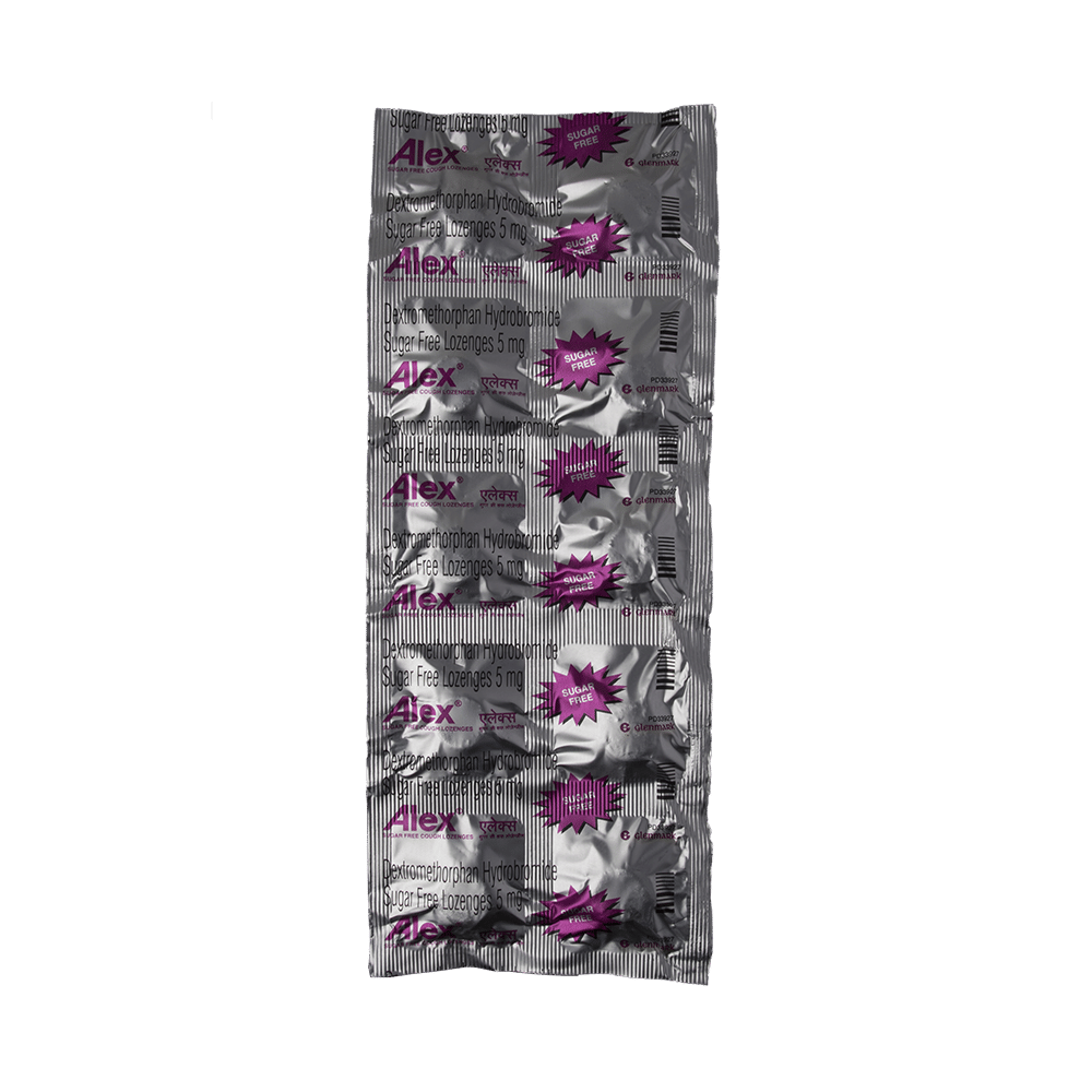 Alex Cough Lozenges Sugar Free is an antitussive medicine. It is used for the treatment of dry cough. It helps by reducing the activity of the cough center in the brain. This medicine is taken by mouth with or without food. You should take it in a proper dose and duration as advised by the doctor. Remember dosage is decided on the basis of type of medicine (syrup or lozenge), age and present medical condition of the person. It is important to finish the full course of treatment even if you feel better. In case you have missed any dose, take it as soon as you remember it. Its beneficial to have plenty of fluids while taking this medication. It is important to note that you should never support self medication or recommend your medicine to other person. Keep out of reach of children as overdose of this medicine can be dangerous. This medicine may cause dizziness as a side effect, so do not drive or do anything that requires mental focus. Rashes and diarrhea may also occur in many individuals.