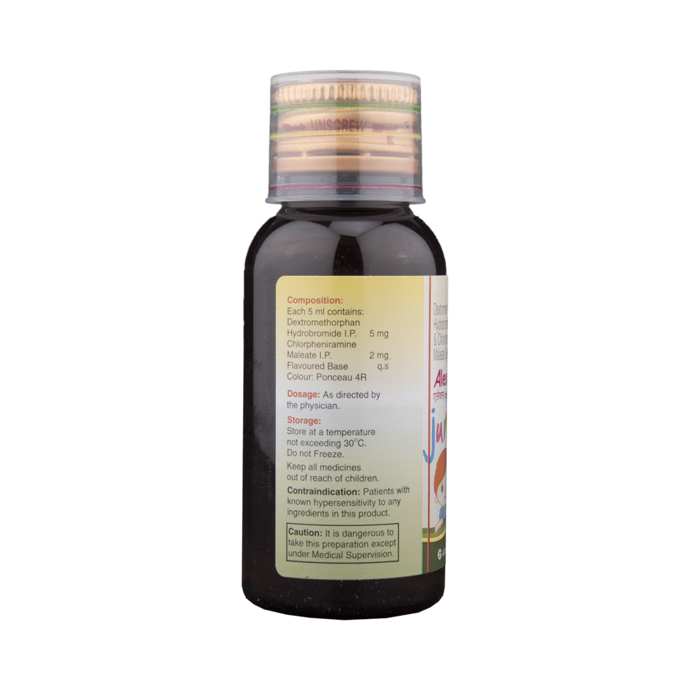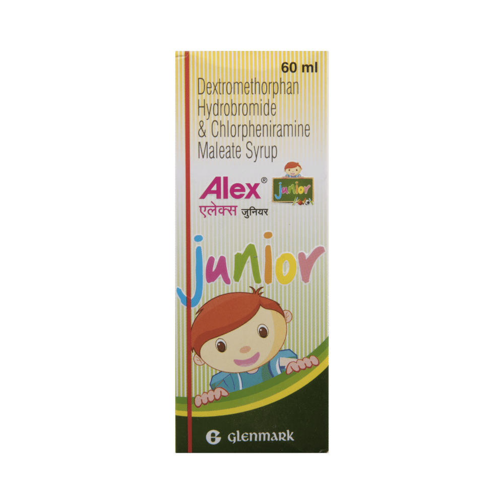 aLEX junior Syrup is a combination of two medicines: Chlorpheniramine Maleate and Dextromethorphan Hydrobromide, which relieves dry cough. Chlorpheniramine Maleate is an antiallergic which helps reduce cough associated with allergies by blocking the effects of a chemical messenger, histamine. Dextromethorphan Hydrobromide is a cough suppressant which relieves cough by reducing the activity of cough center in the brain.