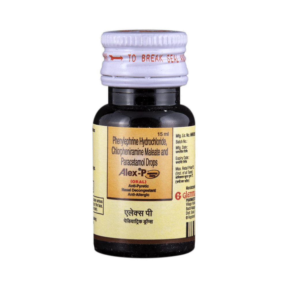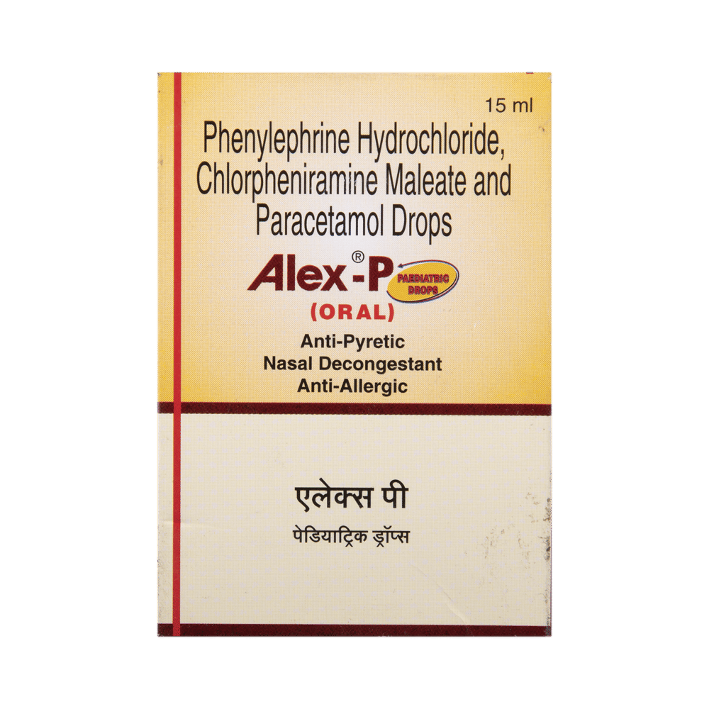 Alex P Paed Drop is a medicine used in the treatment of common cold symptoms. It provides relief from symptoms such as headache, sore throat, runny nose, muscular pain, and fever. Alex P Paed Drop can be taken with or without food. The dose and duration will depend on the severity of your condition. You should keep taking the medicine even if you feel better until the doctor says it is alright to stop using it.Using this medicine may cause a few common side effects such as nausea, vomiting, sleepiness, dizziness, and headache. If any of these side effects do not resolve with time or get worse, you should let your doctor know. Your doctor may be able to suggest ways of preventing or reducing the side effects. In general, you should try to use the smallest amount necessary to control your symptoms.Before using the medicine, you should tell your doctor if you have any other medical conditions or disorders. To make sure it is safe, you should let your doctor know all the other medicines you are taking. Also, tell your doctor if you have any problems with the liver or kidneys. Avoid consumption of alcohol while on treatment with this medicine as it may increase the chance of some side effects. Pregnant and breastfeeding women should consult their doctors first before using the medicine.