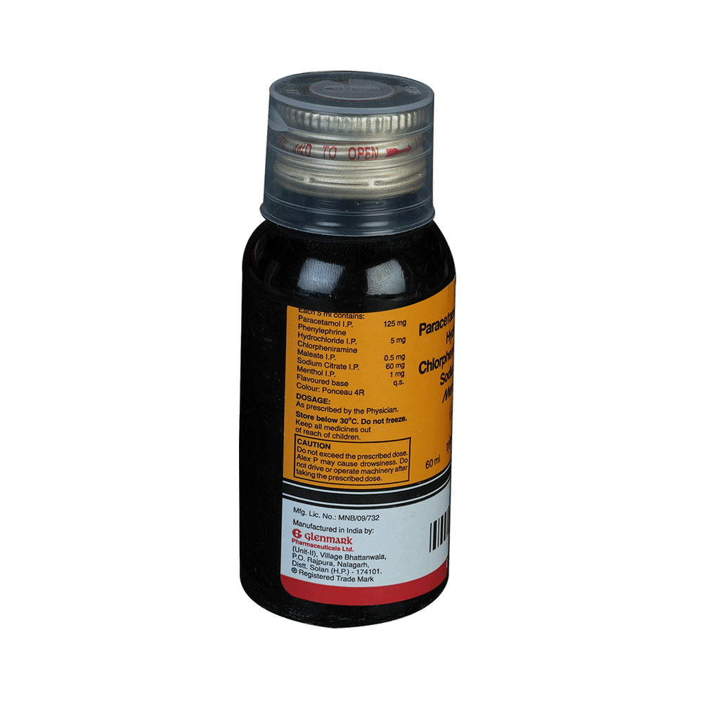 Alex P Syrup is used in the treatment of common cold and cough associated with fever in children. It provides relief from pain and fever and helps treat cough and common cold symptoms like runny nose, stuffy nose, and sneezing. Alex P Syrup is a combination of H1 antihistaminic (first generation), analgesic & antipyretic-PCM,, mucolytic, sympathomimetic-α1 (nasal), and menthol.