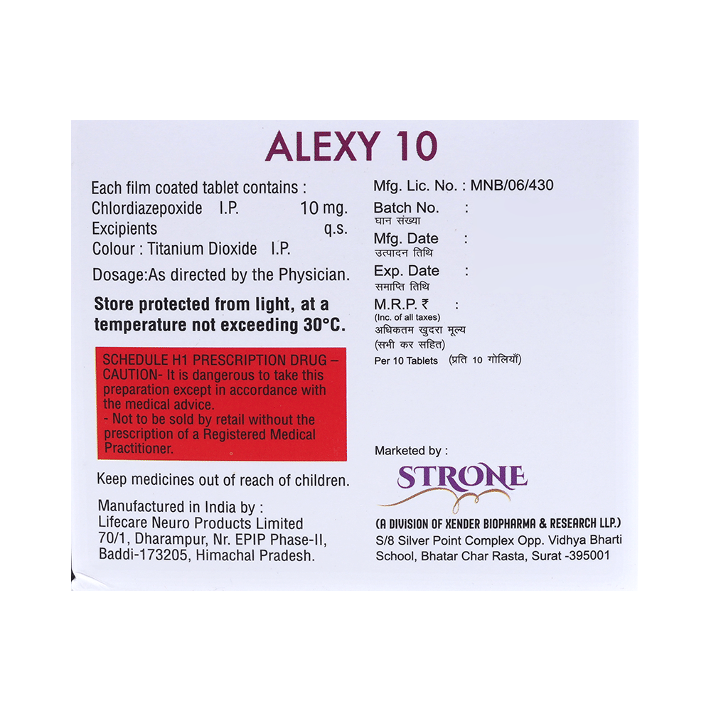 Alexy 10 Tablet belongs to a class of medicines known as benzodiazepine anxiolytics. It is used to treat severe anxiety. It alters brain activity and calms it thereby providing relief. Alexy 10 Tablet may be taken with or without food. However, it is advised to take it at the same time each day as this helps to maintain a consistent level of medicine in the body. Take this medicine in the dose and duration as advised by your doctor as it has a high potential of habit-forming.If you have missed a dose, take it as soon as you remember it and finish the full course of treatment even if you feel better. This medication mustn't be stopped suddenly without talking to the doctor as it may cause nausea and anxiety.The most common side effects of this medicine include lightheadedness, drowsiness, sedation, dizziness, fatigue, balance disorder, unsteadiness, and uncoordinated body movements. It may cause dizziness and sleepiness, so do not drive or do anything that requires mental focus until you know how this medicine affects you. If you have been taking this medicine for a long time then regular monitoring of blood and liver functions may be required.