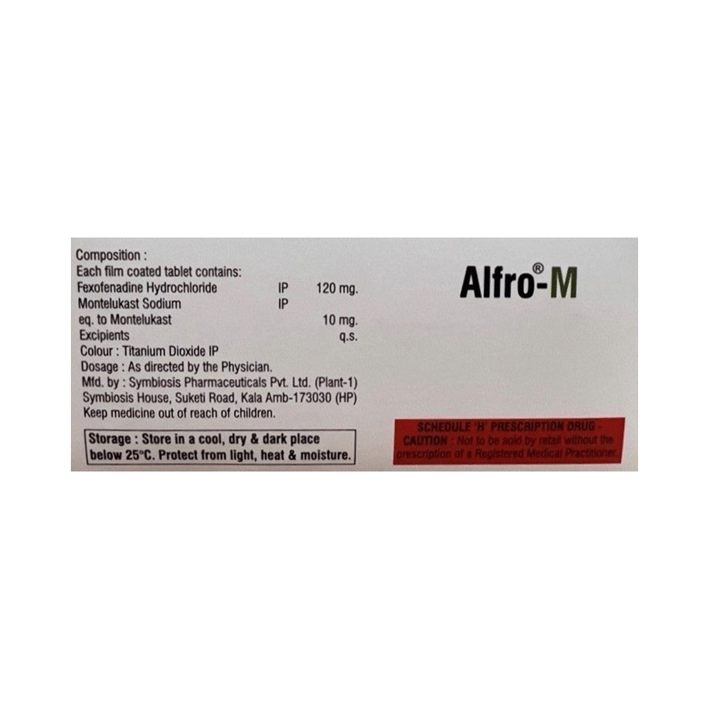 In Treatment of Sneezing and runny nose due to allergiesAlfro-M Tablet is a combination medicine that provides relief from symptoms such as blocked or runny nose, sneezing and itchy or watery eyes. This will make it easier for you to go about your daily activities. It rarely has any serious side effects and you may only need to take it on days you have symptoms. If you are taking it to prevent getting symptoms you should use it regularly to get the most benefit.