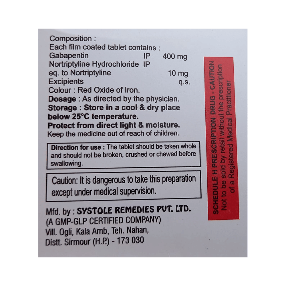 Salt Composition: Gabapentin (400mg) + Nortriptyline (10mg)