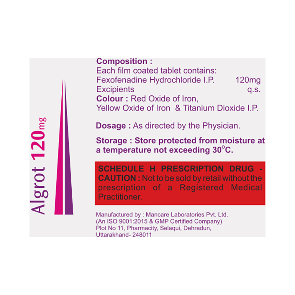 Algrot 120mg Tablet belongs to a class of medicines called antihistamines. It blocks the effects of a chemical called histamine, which is responsible for causing inflammation and its associated symptoms such as itching, redness, swelling, and irritation.