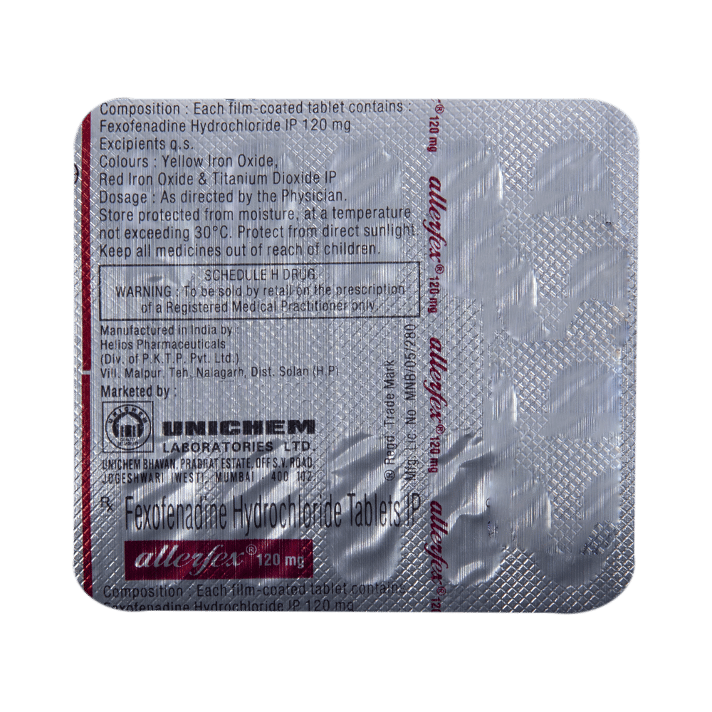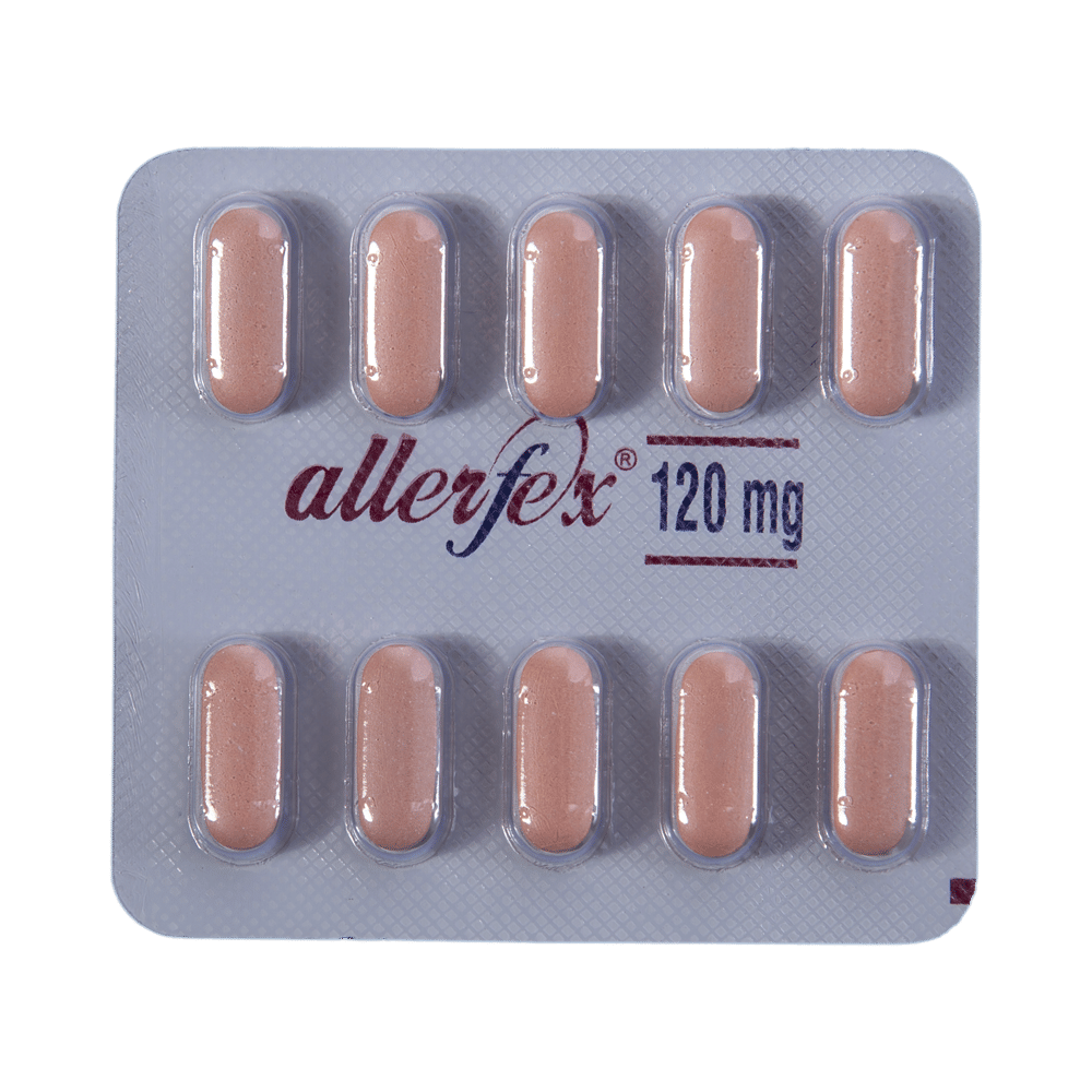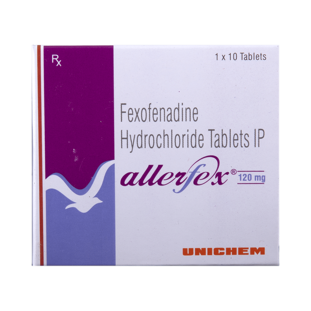 Allerfex 120mg Tablet is an anti-allergy medicine used in the treatment of allergic symptoms such as runny nose, congestion or stuffiness, sneezing, itching, swelling, and watery eyes. It also helps treat skin allergies with itching, redness, or swelling. Allerfex 120mg Tablet may be taken with or without food, in the dose and duration as advised by the doctor. The dose you are given will depend on your condition and how you respond to the medicine. You should keep taking this medicine for as long as your doctor recommends. Do not stop taking it without consulting your doctor.The most common side effects are headache, drowsiness, dizziness, and nausea. Most of these are temporary and usually resolve with time. Please consult your doctor if any of these side effects do not resolve or persist for a longer duration.Do not self-medicate or recommend your medicine to another person even if you see the similarity in symptoms. Consult your doctor to get the most benefit. Inform your doctor if you are suffering from any problems related to the kidneys, liver, or heart. Pregnant and breastfeeding mothers should not take this medicine without consulting a doctor.