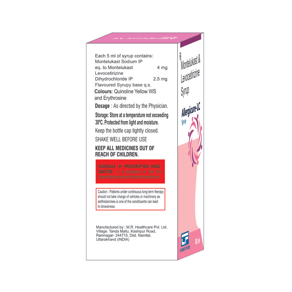 Allergicure-LC Syrup is commonly prescribed in children to treat symptoms of allergy such as runny nose, sneezing, itching, swelling, congestion, and watery eyes. It may also help in the treatment of asthma and skin allergies. Give this medicine to your child at a fixed time before or after food in the prescribed dose, time, and way. For asthma, prefer giving Allergicure-LC Syrup in the evening or 2 hours before physical activity. For allergy, it is best to give it either in the morning or in the evening, depending upon the time of onset of symptoms. In case your child has both, prefer giving it in the evening. If your child vomits within 30 minutes of taking this medicine, give the same dose again, but skip it if it’s already time for the next dose.Your child may start to feel better after a few regular doses. However, you must still complete the prescribed dose to ensure maximum benefit. Moreover, stopping the medicine abruptly may worsen your child’s condition. This medicine may cause some minor and temporary side effects like vomiting, diarrhea, nausea, dizziness, dry mouth, rash, and headache. Usually, these episodes subside once your child’s body adapts to the medicine. However, in case these effects persist or start bothering your child, consult your child’s doctor without any delay.Let your child’s doctor know if your child is already taking any medicines. Also, narrate your child’s complete medical history, including any prior episodes of allergy, heart problem, blood disorder, vascular disorders, birth defects, airway obstruction, lung anomaly, skin disorder, liver impairment, and kidney malfunction. This information is critical for dose alterations and in planning your child’s overall treatment.