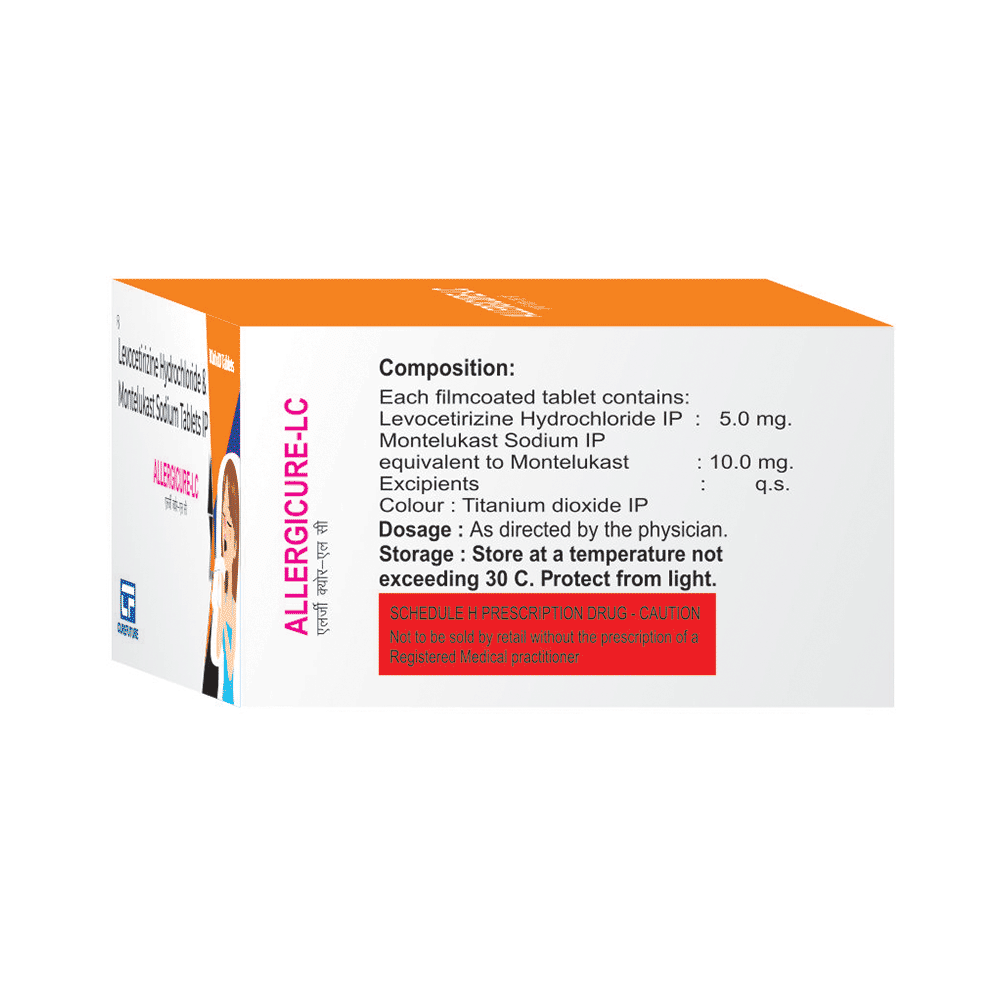 In Treatment of Allergic skin conditionsAllergicure-LC Tablet is effective in treating allergic skin conditions with inflammation and itching. It reduces the actions of chemicals in the body that cause inflammation of the skin. When used correctly it is a safe and effective treatment. It reduces the redness, rash, pain or itchiness caused by your skin’s reaction to an irritant. It thus improves your self-esteem and confidence as your appearance changes. Keep taking it for as long as it is prescribed to get the full benefits.In Treatment of Sneezing and runny nose due to allergiesAllergicure-LC Tablet is a combination medicine that provides relief from symptoms such as blocked or runny nose, sneezing and itchy or watery eyes. This will make it easier for you to go about your daily activities. It rarely has any serious side effects and you may only need to take it on days you have symptoms. If you are taking it to prevent getting symptoms you should use it regularly to get the most benefit.In Treatment of Hay feverHay fever, also called allergic rhinitis, causes cold-like signs and symptoms, such as a runny nose, itchy eyes, congestion, sneezing and sinus pressure. The only difference is that in hay fever, these symptoms are not produced due to a virus but are simply allergic responses of our body to allergens (allergy causing agents such as pollen). Allergicure-LC Tablet is used to provide relief from these symptoms of hay fever. It works by blocking the release of the chemical substance responsible for producing such allergy symptoms. Allergicure-LC Tablet is a safe medicine which helps treat hay fever and makes us feel at ease.show moreshow less