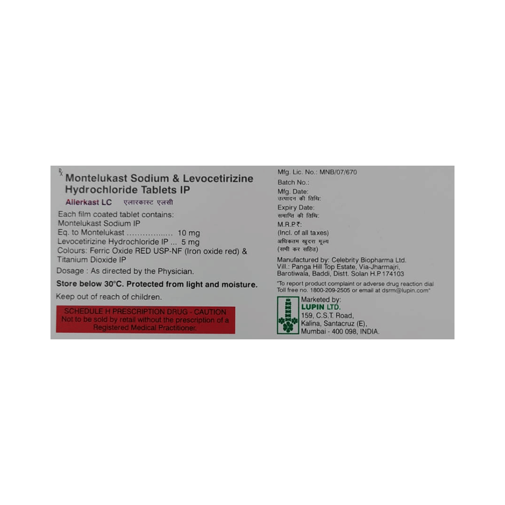 In Treatment of Allergic skin conditionsAllerkast LC Tablet is effective in treating allergic skin conditions with inflammation and itching. It reduces the actions of chemicals in the body that cause inflammation of the skin. When used correctly it is a safe and effective treatment. It reduces the redness, rash, pain or itchiness caused by your skin’s reaction to an irritant. It thus improves your self-esteem and confidence as your appearance changes. Keep taking it for as long as it is prescribed to get the full benefits.In Treatment of Sneezing and runny nose due to allergiesAllerkast LC Tablet is a combination medicine that provides relief from symptoms such as blocked or runny nose, sneezing and itchy or watery eyes. This will make it easier for you to go about your daily activities. It rarely has any serious side effects and you may only need to take it on days you have symptoms. If you are taking it to prevent getting symptoms you should use it regularly to get the most benefit.In Treatment of Hay feverHay fever, also called allergic rhinitis, causes cold-like signs and symptoms, such as a runny nose, itchy eyes, congestion, sneezing and sinus pressure. The only difference is that in hay fever, these symptoms are not produced due to a virus but are simply allergic responses of our body to allergens (allergy causing agents such as pollen). Allerkast LC Tablet is used to provide relief from these symptoms of hay fever. It works by blocking the release of the chemical substance responsible for producing such allergy symptoms. Allerkast LC Tablet is a safe medicine which helps treat hay fever and makes us feel at ease.show moreshow less