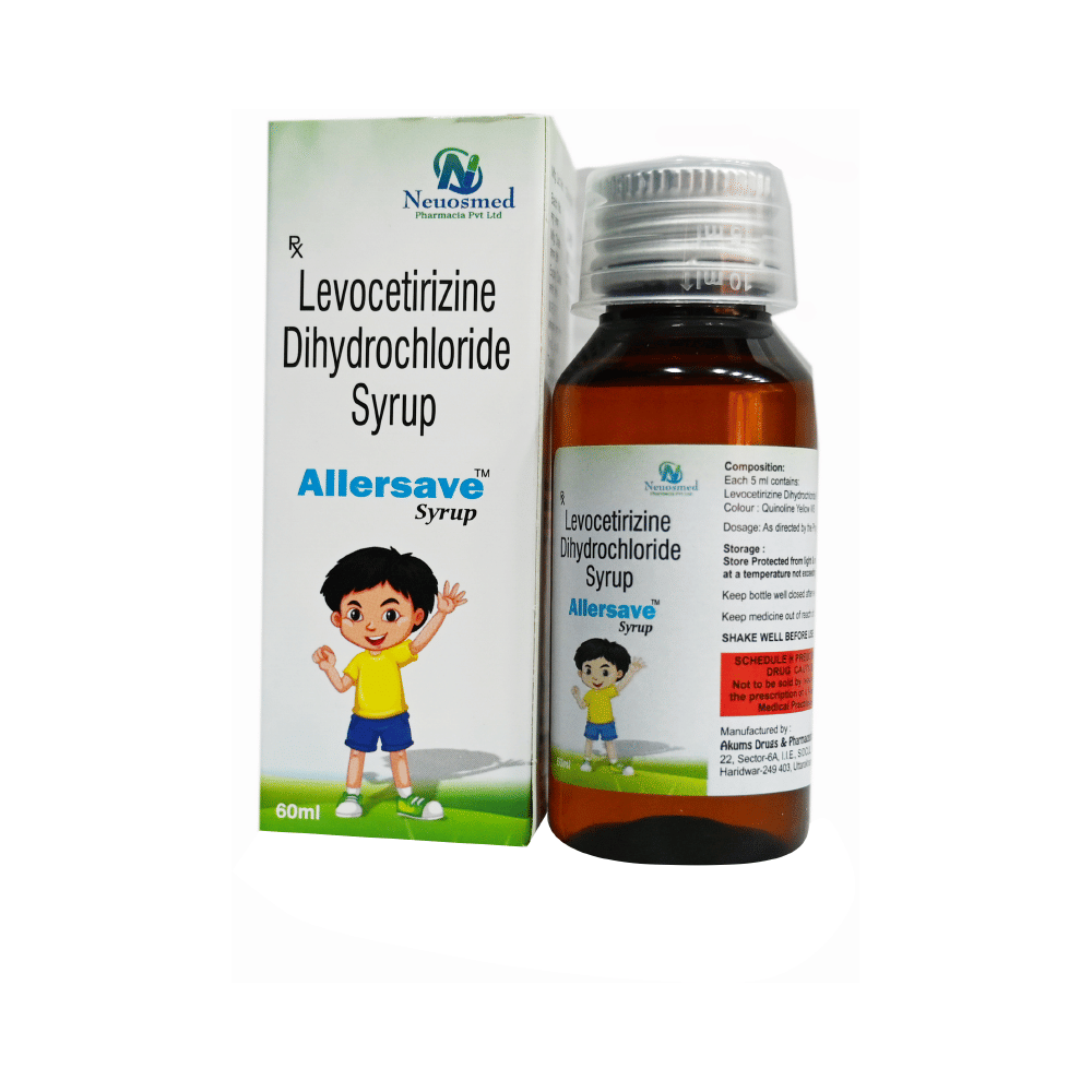 Allersave Syrup belongs to a group of medicines called antihistamines. It is used to treat various allergic conditions such as hay fever, conjunctivitis, and some skin reactions such as eczema, hives, and reactions to bites and stings. It relieves watery eyes, runny nose, sneezing, and itching. Allersave Syrup can be given with or without food. Your required dose may depend on the condition being treated. While this medicine is generally best given to your child in the evening, always follow your doctor’s instructions for proper use. Continue giving for as long as the doctor has prescribed. If it is stopped earlier than advised, your symptoms may come back.The most common side effects include feeling sleepy or dizzy, dry mouth, fatigue, fever, cough, vomiting, and diarrhea. These are usually mild and go away after a couple of days as your body adjusts to it. Consult your doctor if any of the side effects persist or worsen.Before taking it, tell your doctor if you have any kidney problems or epilepsy (seizures). Your dose may need to be modified, or this medicine may not suit you. Certain medications may interact with this one, so inform your doctor about any other medicines you are taking. If you are pregnant or breastfeeding, consult your doctor before use, even though it is not considered harmful.