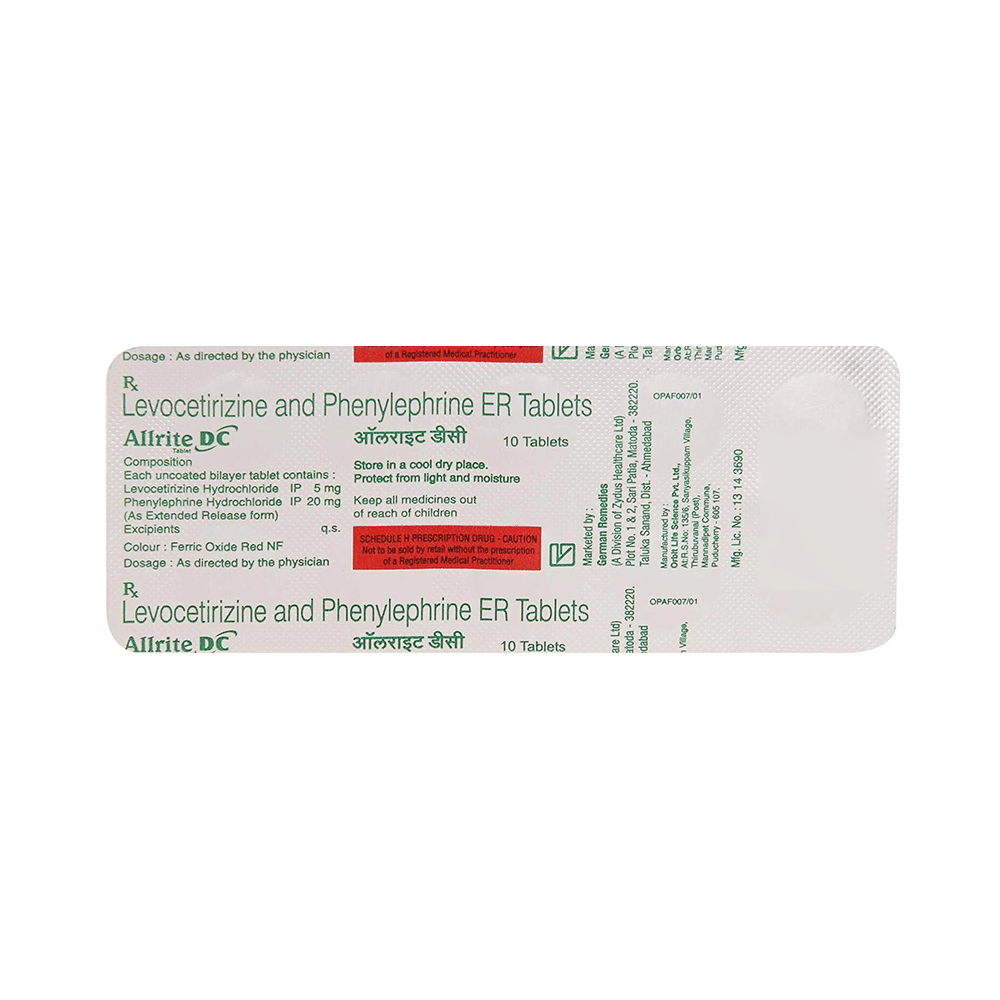 Allrite DC Tablet ER is a combination of two medicines: Levocetirizine and Phenylephrine, which relieves sneezing and runny nose caused due to allergies.