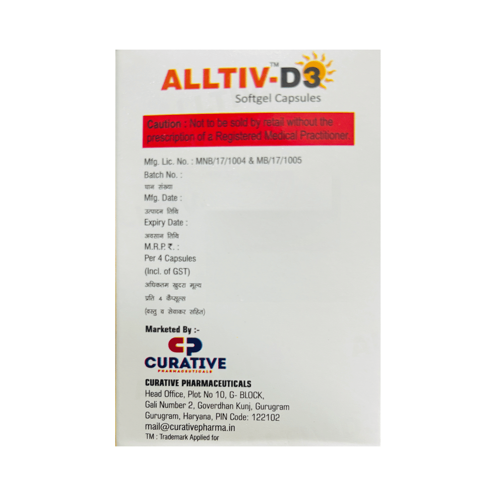 Alltiv-D3 Softgel Capsule is used in the treatment of vitamin D deficiency and osteoporosis. It helps the body to absorb calcium. Calcium is essential for maintaining strong and healthy bones. It is used when your diet does not provide enough calcium. Alltiv-D3 Softgel Capsule should be taken as directed by your doctor. It is best taken with or after food, as this helps your body absorb it, and you should take it regularly to get the most benefits. If you are using it to treat osteoporosis, you will also be prescribed other medicines. This medicine may be only part of a complete treatment program that includes making changes to your diet and taking calcium and vitamin supplements. Learn about the foods you should eat to ensure you get enough calcium and vitamin D.Alltiv-D3 Softgel Capsule has few side effects, and none are common. If you take too much, you may feel weakness, muscle pain, or a metallic taste in your mouth. If you experience any such side effects, speak with your doctor. They may be able to help you reduce or treat the symptoms.Before taking this medicine, tell your doctor if you have high calcium levels in your blood or if you have any heart, kidney, or liver disease. Some other medicines can decrease the absorption of vitamin D3, so let your doctor know about all the other medicines you are taking to make sure you are safe. This medicine may help during pregnancy when your body needs more vitamin D, but too much could harm your baby. Discuss it with your doctor.