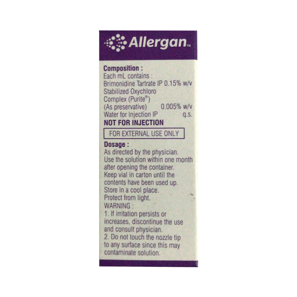 Alphagan P Eye Drop is a medicine used in the treatment of glaucoma. It decreases the fluid (aqueous humor) production in the eye which relieves the pressure in the eye. This way it relieves the symptom and speeds up the healing. Alphagan P Eye Drop is to be used only in the affected eye in the dose and duration as advised by the doctor. Wash your hands before using this medicine. It is advised to check the label for directions before use. Do not skip any doses and finish the full course of treatment even if you feel better.The most common side effects include itching, stinging, redness, and burning sensation at the site of application, and foreign body sensation.In case of accidental contact with your ears, nose, or mouth, immediately rinse it with water.Inform your doctor if you have a known allergy to any of the ingredients in this medicine or if you are taking any other medication. It is advised not to drive or operate heavy machinery immediately after using this medicine as it may cause temporary blurring of vision and may affect your ability to drive.