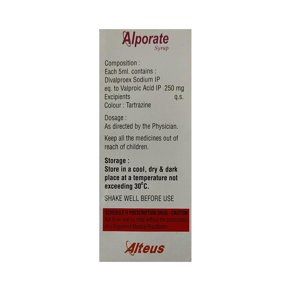 Alporate Syrup is a medication used to treat epilepsy, seizures, bipolar disorder, mania, trigeminal neuralgia, and migraines. It works by stabilizing brain activity. Always use it under medical supervision for safe and effective treatment. Alporate Syrup may be used alone or in combination with other medicines. Your doctor will determine the appropriate dose and frequency to effectively control your symptoms. You can take this medicine with or without food, but for the best results, take it at the same time each day. It usually takes a couple of weeks to work. It is important to take this medicine regularly and for as long as you are advised, even if you feel well. Missing doses may trigger seizures, and if you stop, your condition may get worse. It should never be stopped suddenly.The most common side effects of Alporate Syrup include headache, constipation, nausea, vomiting, dizziness, weight gain, rash, back pain, and abdominal pain. Most of these are not serious. Continue taking the medicine, but consult your doctor if these side effects persist or become bothersome. However, if you notice a skin rash or redness, tell your doctor straight away. Long-term treatment with this medicine can cause osteoporosis (reduced bone mass) and increase your risk of breaking a bone. Also, Alporate Syrup may rarely lead to suicidal thoughts and behaviors. If your mood becomes depressed, tell your doctor.Alporate Syrup may not be suitable for everybody. Before using it, tell your doctor if you have ever had heart problems, kidney or liver disease, difficulty urinating, depression, or suicidal thoughts. Some medicines can interfere with it and should not be taken together, so tell your doctor about all the medicines you are taking to make sure it is safe for you. If you are pregnant, do not take this medicine without asking your doctor. Avoid drinking alcohol, as it may enhance certain side effects and increase the risk of seizures. You may need frequent blood tests to help your doctor make sure you are taking the right dose both before you start and while you are using it.