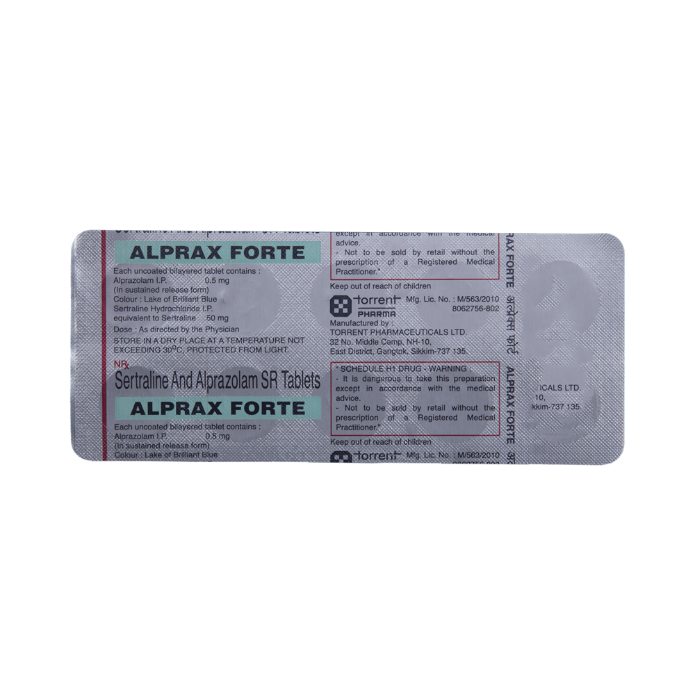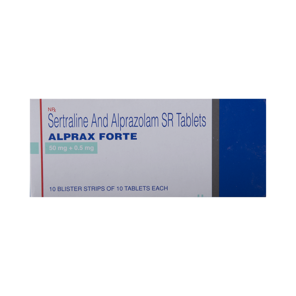 Alprax Forte 0.5 mg/50 mg Tablet is a prescription medicine used to treat depression. It is a combination medicine which calms the brain by decreasing the abnormal and excessive activity of the nerve cells. It also increases the levels of some chemical messengers in the brain and improves mood. Alprax Forte 0.5 mg/50 mg Tablet is taken with or without food. However, it is advised to take it at the same time each day as this helps to maintain consistent levels of medicine in the body. Take this medicine in the dose and duration advised by your doctor as it has habit-forming potential. If you miss a dose of this medicine, take it as soon as you remember. Finish the full course of treatment even if you feel better. It is important not to stop taking this medicine suddenly as this may cause nausea, stomach upset, flu-like withdrawal symptoms, sleep disturbance and anxiety.Some common side effects of this medicine include nausea, vomiting, diarrhea, confusion, memory impairment, and low sexual desire. It may also cause dizziness and sleepiness. So, do not drive or do anything that requires mental focus until you know how this medicine affects you. It may cause weight gain or weight loss depending upon person to person. To prevent weight gain, you can eat a healthy balanced diet, avoid snacking with high-calorie food and exercise regularly. On the other hand, weight loss can be managed by consulting a dietitian who can help you increase the food portions. It is important to inform your doctor if you develop any unusual changes in mood as it may cause suicidal thoughts.Take caution while taking medicine if you are suffering from liver disease. Your doctor should also know about all other medicines you are taking as many of these may make this medicine less effective or change the way it works. Inform your doctor if you are pregnant, planning pregnancy or breastfeeding.