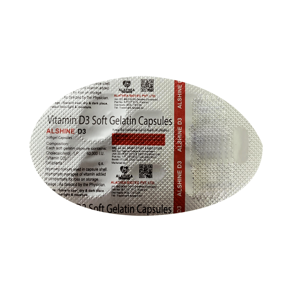 Alshine D3 Softgel Capsule is used in the treatment of vitamin D deficiency and osteoporosis. It helps the body to absorb calcium. Calcium is essential for maintaining strong and healthy bones. It is used when your diet does not provide enough calcium. Alshine D3 Softgel Capsule should be taken as directed by your doctor. It is best taken with or after food, as this helps your body absorb it, and you should take it regularly to get the most benefits. If you are using it to treat osteoporosis, you will also be prescribed other medicines. This medicine may be only part of a complete treatment program that includes making changes to your diet and taking calcium and vitamin supplements. Learn about the foods you should eat to ensure you get enough calcium and vitamin D.Alshine D3 Softgel Capsule has few side effects, and none are common. If you take too much, you may feel weakness, muscle pain, or a metallic taste in your mouth. If you experience any such side effects, speak with your doctor. They may be able to help you reduce or treat the symptoms.Before taking this medicine, tell your doctor if you have high calcium levels in your blood or if you have any heart, kidney, or liver disease. Some other medicines can decrease the absorption of vitamin D3, so let your doctor know about all the other medicines you are taking to make sure you are safe. This medicine may help during pregnancy when your body needs more vitamin D, but too much could harm your baby. Discuss it with your doctor.