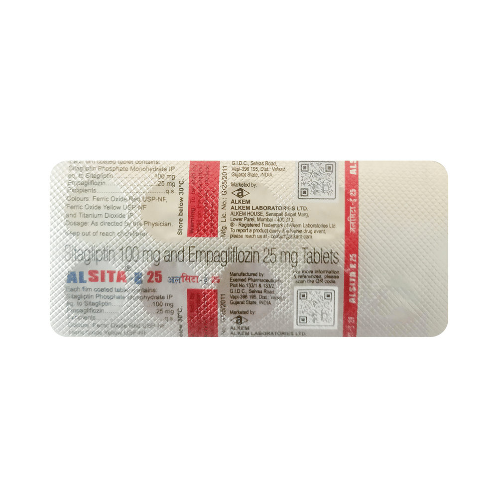 Alsita-E 25 Tablet is a combination of two medicines, empagliflozin and sitagliptin, which help control blood sugar levels in people with type 2 diabetes. Empagliflozin works by helping the kidneys remove extra sugar from the body through urine. Sitagliptin helps the body release more insulin when blood sugar is high and reduces the amount of sugar made by the liver. By working in different ways, these two medicines complement each other and provide better blood sugar control than either medicine alone.