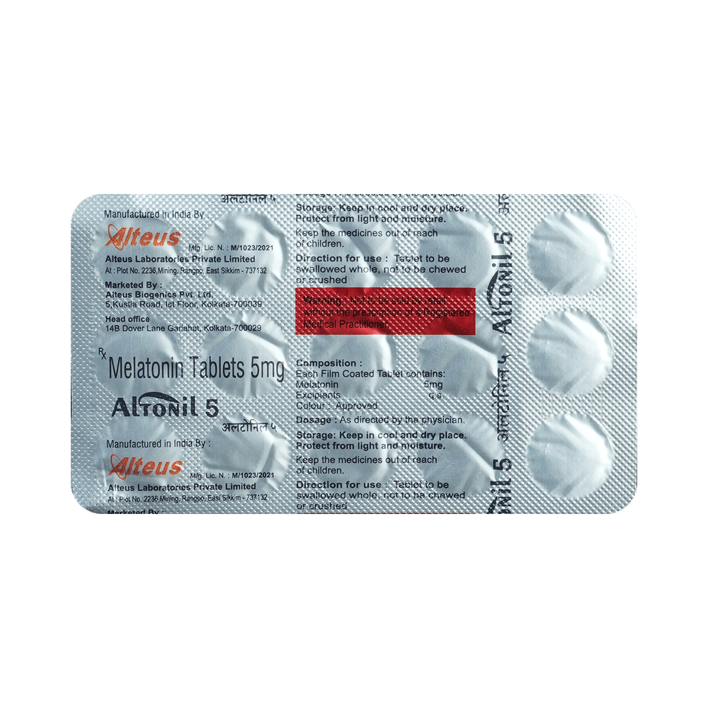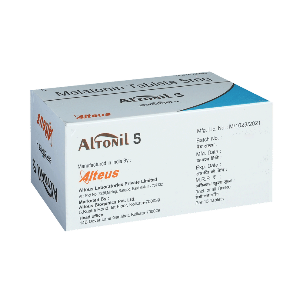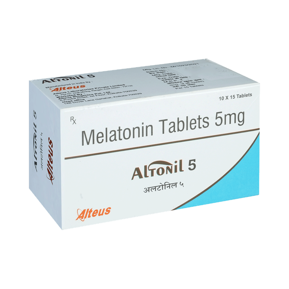 ALTonil 5mg Tablet is a medicine used in the treatment of insomnia and jet lag (a sleep disorder due to frequent travel to different time zones). It reduces jet lag symptoms such as irritability, indigestion, daytime tiredness, and sleep disturbances. ALTonil 5mg Tablet helps to synchronize the body’s biological day-night rhythm. It should be taken either 2 hours before or 2 hours after food, preferably at bedtime. However, it is advised to take it at a fixed time each day to maintain a consistent level of medicine in the blood. You should never skip any doses and finish the full course of treatment even if you feel better. This medicine should not be stopped suddenly without talking to your doctor.Some common side effects of this medicine include headache and drowsiness. It even causes dizziness and sleepiness, so do not drive or do anything that requires mental focus until you know how this medicine affects you. It is important to note that this medicine should not be used for daily naps.Consult your doctor before taking this medicine if you are suffering from any liver or kidney problems. You should avoid smoking and alcohol while using this medicine. Pregnant and breastfeeding mothers should not use this medicine. However, if the need arises, please consult your doctor before using it.