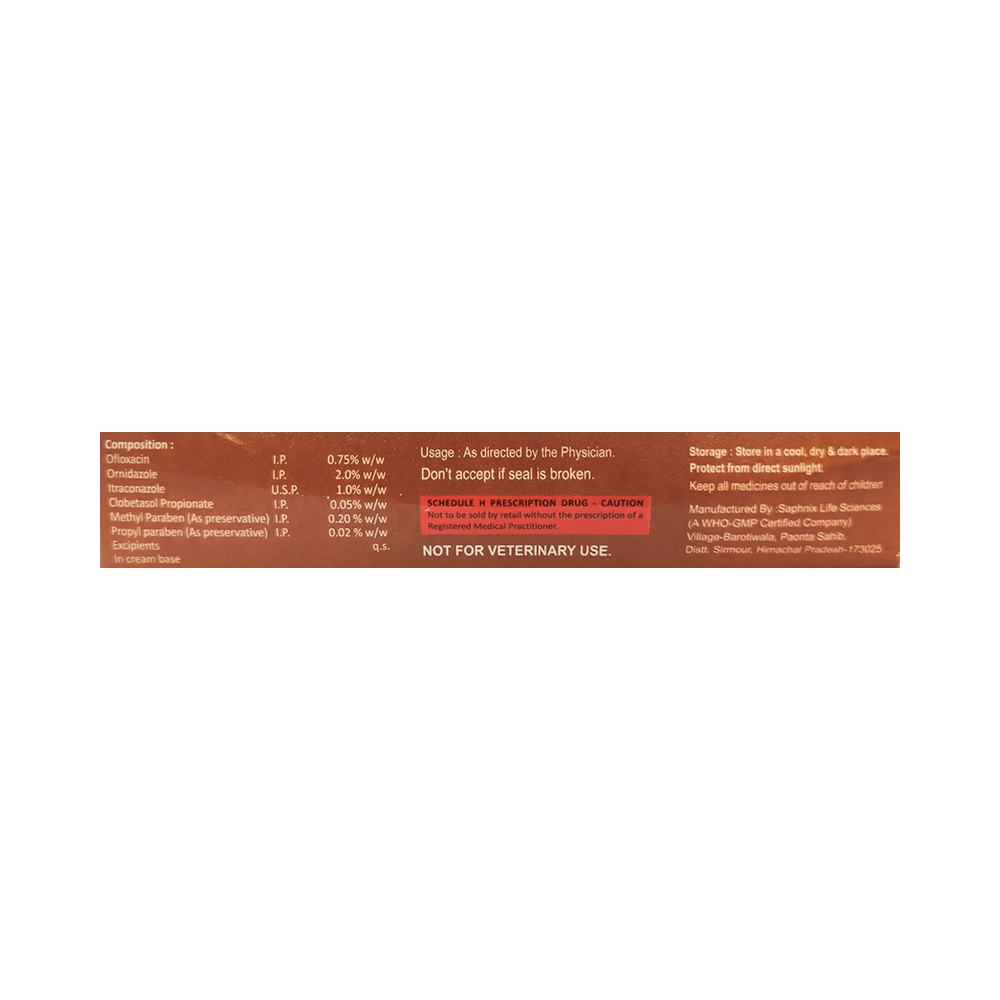 Salt Composition: Ofloxacin (0.75% w/w) + Ornidazole (2% w/w) + Itraconazole (1% w/w) + Clobetasol (0.05% w/w)