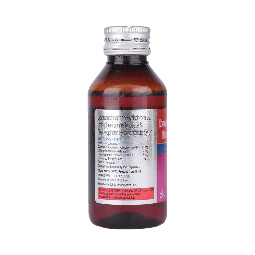 Altuss DM Liquid is a combination of three medicines: Phenylephrine, Chlorpheniramine Maleate, and Dextromethorphan Hydrobromide. Phenylephrine is a decongestant which narrows the small blood vessels providing relief from congestion or stuffiness in the nose. Chlorpheniramine Maleate is an antiallergic which relieves allergy symptoms like runny nose, watery eyes and sneezing. Dextromethorphan Hydrobromide is a cough suppressant which relieves cough by reducing the activity of cough center in the brain.
