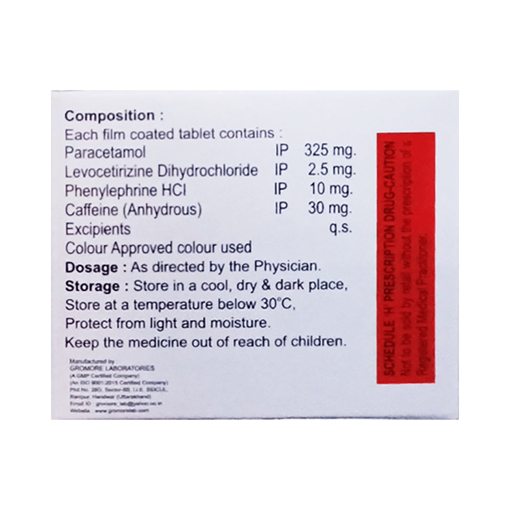 Salt Composition: Caffeine (30mg) + Paracetamol (325mg) + Levocetirizine (2.5mg) + Phenylephrine (10mg)