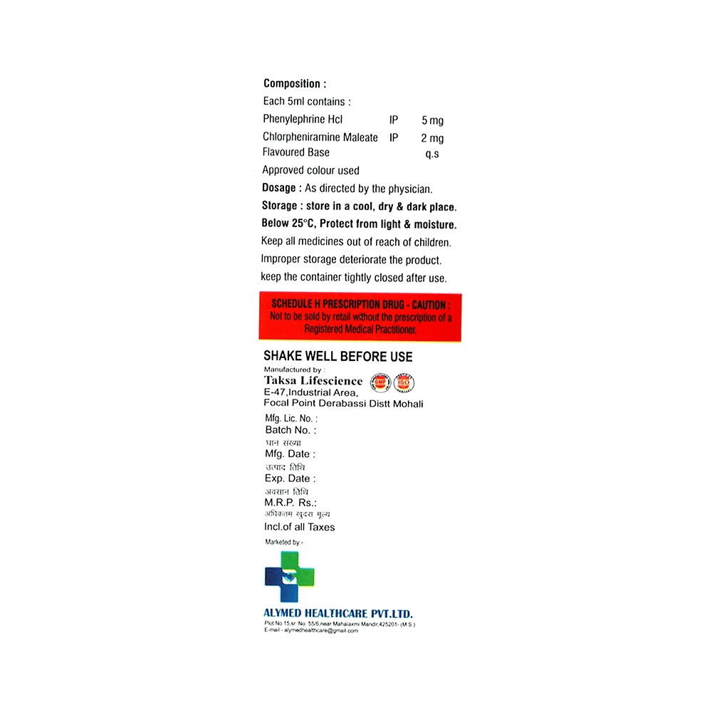 Alycold Oral Suspension is a combination medicine used for the symptomatic treatment of common cold in children. It helps relieve discomfort caused by a runny nose, blocked nose, and sneezing, allowing the child to breathe more easily and feel better. Alycold Oral Suspension may be given to your child with or without food. Always follow the exact dose and duration prescribed by the doctor. The dosage will depend on your child’s age, weight, and the severity of symptoms. Do not stop the medicine early, even if your child seems to be feeling better, unless advised by the doctor.Common side effects may include nausea, vomiting, or headache. These are usually mild and temporary. However, if you notice anything unusual or are concerned about how your child is responding to the medicine, consult your doctor promptly. This medicine may also cause drowsiness, so avoid engaging your child in activities that require alertness until you know how it affects them.Make sure your child stays well hydrated while taking Alycold Oral Suspension. Inform your doctor if your child has any history of liver or kidney problems, as the dose may need to be adjusted accordingly.Note: As per the Ministry of Health and Family Welfare, Alycold Oral Suspension should not be used in children below 4 years of age.