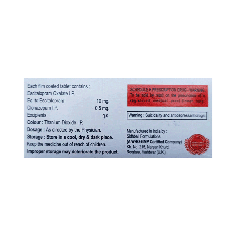 Salt Composition: Clonazepam (0.5mg) + Escitalopram Oxalate (10mg)