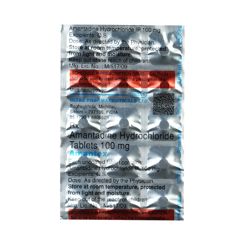 Amantex Tablet is used alone or in combination with other medicines to treat Parkinson’s disease. It works by increasing the levels of a chemical called dopamine in the brain, which is important for controlling movement. Amantex Tablet helps in improving muscle control and reducing stiffness by affecting specific brain chemicals. Take Amantex Tablet as prescribed by your doctor, with or without food, preferably at the same time each day, to maintain a steady level of the medicine in your body. It can also be used to treat drug-induced movement disorders.Take this medicine in the dose and duration as advised by your doctor. If you have missed a dose, take it as soon as you remember it. You should finish the full course of treatment even if you feel better. This medication must not be stopped suddenly without talking to your doctor.Some common side effects of Amantex Tablet include nausea, dizziness, and insomnia (difficulty sleeping). If you experience dizziness, rise slowly and do not drive or do anything that requires mental focus until you know how this medicine affects you.This medicine may put you at a higher risk of having seizures, so talk to your doctor if you have any history of seizures or if you are taking any medication for seizures. Pregnant or breastfeeding women should consult a doctor before taking this medicine to make sure it is safe for them.