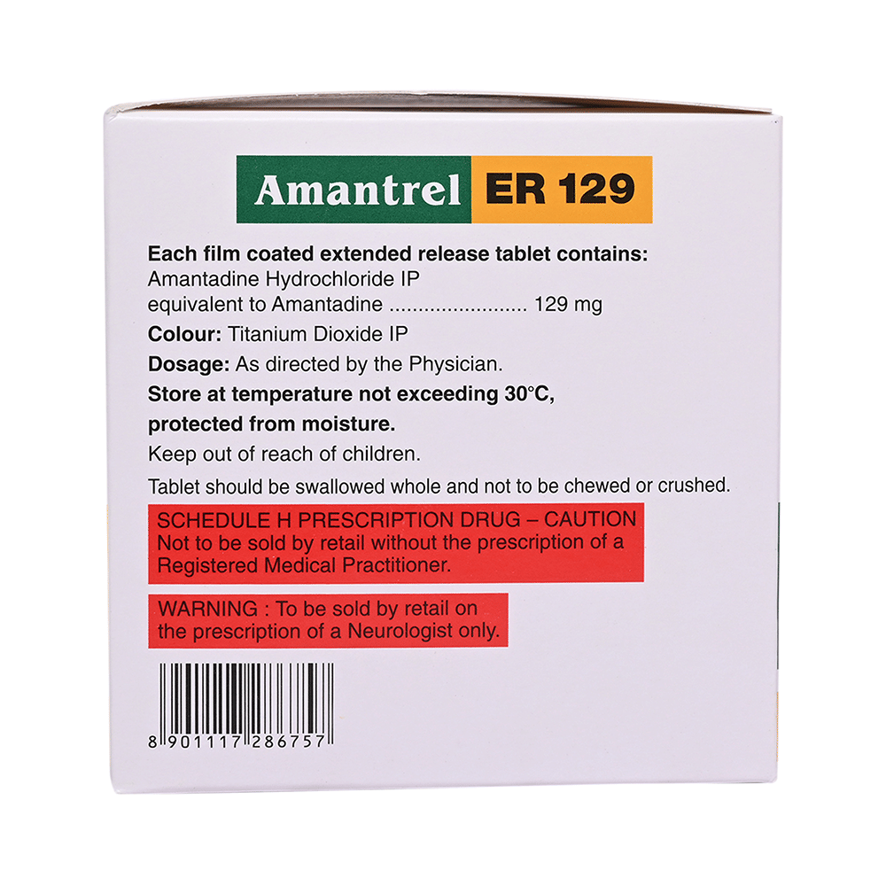 Amantrel 129mg Tablet ER is used alone or in combination with other medicines to treat Parkinson’s disease. It works by increasing the levels of a chemical called dopamine in the brain, which is important for controlling movement. Amantrel 129mg Tablet ER helps in improving muscle control and reducing stiffness by affecting specific brain chemicals. Take Amantrel 129mg Tablet ER as prescribed by your doctor, with or without food, preferably at the same time each day, to maintain a steady level of the medicine in your body. It can also be used to treat drug-induced movement disorders.Take this medicine in the dose and duration as advised by your doctor. If you have missed a dose, take it as soon as you remember it. You should finish the full course of treatment even if you feel better. This medication must not be stopped suddenly without talking to your doctor.Some common side effects of Amantrel 129mg Tablet ER include nausea, dizziness, and insomnia (difficulty sleeping). If you experience dizziness, rise slowly and do not drive or do anything that requires mental focus until you know how this medicine affects you.This medicine may put you at a higher risk of having seizures, so talk to your doctor if you have any history of seizures or if you are taking any medication for seizures. Pregnant or breastfeeding women should consult a doctor before taking this medicine to make sure it is safe for them.