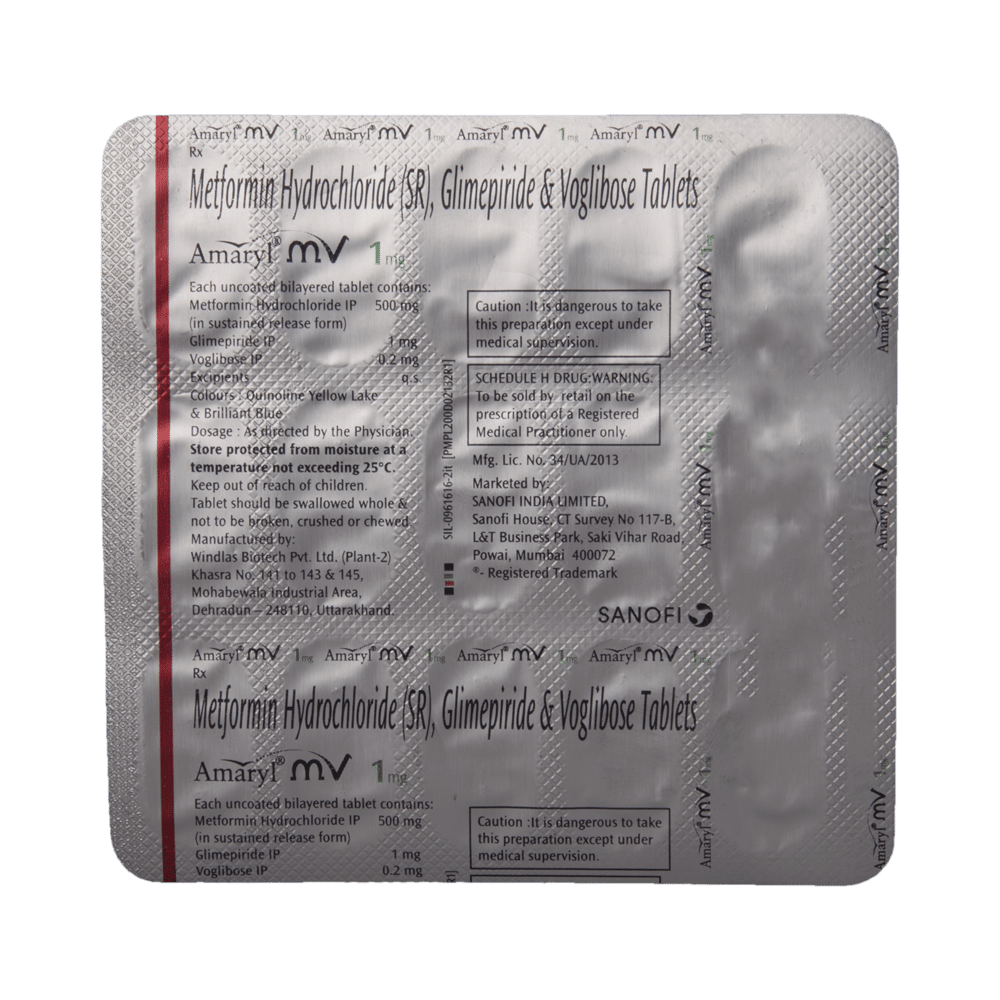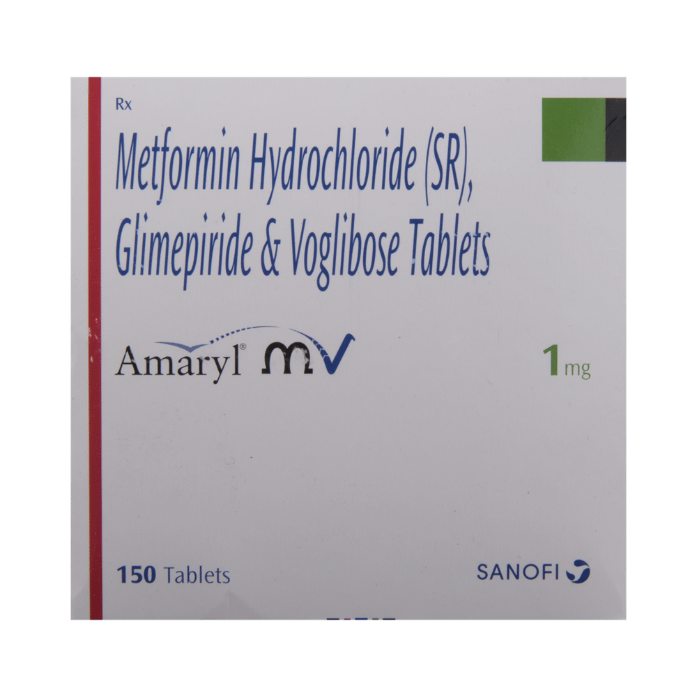 Amaryl MV 1mg Tablet SR is a combination of three antidiabetic medicines: glimepiride, metformin, and voglibose. They work by different mechanisms to provide better control of blood sugar when single or dual therapy is not effective. Glimepiride is a sulfonylurea that works by increasing the amount of insulin released by the pancreas to lower the blood glucose. Metformin is a biguanide that lowers glucose production in the liver, delays glucose absorption from the intestines, and increases the body's sensitivity to insulin. Voglibose is an alpha-glucosidase inhibitor that prevents the breakdown of complex sugars into simple sugars such as glucose. This prevents the blood glucose levels from rising to very high levels after meals.